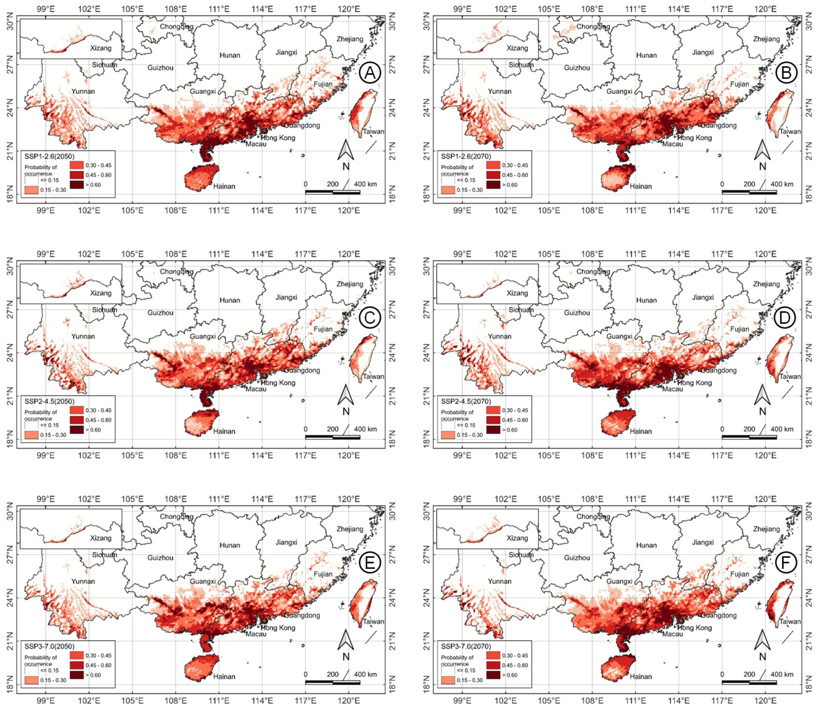 APA StyleXie, C., Chen, Z., Yu, M., & Jim, C. Y. (2025). Impact of Climate Change on the Invasion of Mikania micrantha Kunth in China: Predicting Future Distribution Using MaxEnt Modeling. Plants, 14(23), 3694. https://doi.org/10.3390/plants14233694