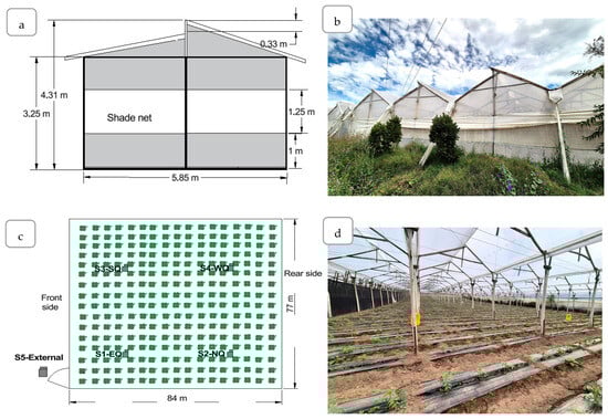 Structural layout of the greenhouse and spatial distribution of climatic sensors. (a) Scheme of frontal perspective. (b) Frontal exterior view. (c) Position of the data loggers. (d) Interior view. Note: S1-EQ = Eastern Quadrant; S2-NQ = Northern Quadrant; S3-SQ = Southern Quadrant; S4-WQ = Western Quadrant.