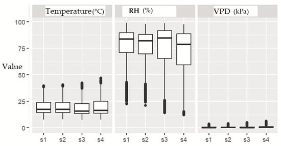 Boxplots (Figure 3) illustrate the variability in temperature, relative humidity, and vapor pressure deficit recorded by each sensor, providing a clear visualization of distribution patterns and the occurrence of outliers.