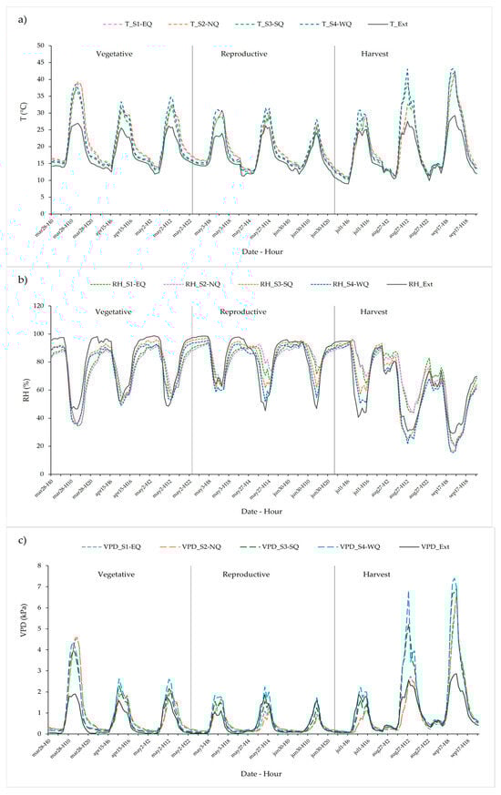 Temporal dynamics of internal and external microclimatic variables during representative days of each phenological stage. (a) Temperature, (b) Relative Humidity (RH), and (c) Vapor Pressure Deficit (VPD) recorded hourly by four internal sensors (dashed lines) and one external sensor (solid line) over three selected days per stage (vegetative, reproductive, and harvest). The plots illustrate diurnal and nocturnal patterns and highlight the coupling and decoupling between internal and external conditions.