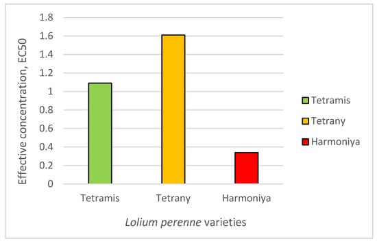 The effective concentration that inhibits the germination in 50% of the seeds (EC50) ranged from 0.34 to 3.21% sucrose (Figure 1), and the studied L. perenne varieties could be arranged in the following ascending order: variety Harmoniya [average EC50 = 0.78 (0.34–1.76)] < variety Tetramis [average EC50 = 1.76 (1.09–2.83)] < variety Tetrany [average EC50 = 2.27 (1.61–3.21)]. Differences in the EC50 values can be explained by genetic differences and the way the varieties have been produced, since the comparisons were made under the same controlled laboratory conditions.