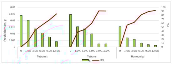 The dynamics of accumulation of fresh biomass of germs in the early stages of growth depended on the variety, and the applied concentration of sucrose is presented in Figure 2. Drought stress in terms of shoot weight caused by the application of the lowest sucrose concentration (1.0%) had a relatively lower suppressive effect in variety Tetrany (IR% = 14.89) and a greater effect in variety Harmoniya (IR% = 55.12). A greater depression in the accumulation of fresh germ biomass was reported with increasing sucrose concentration (from 3 to 12%), the differences being statistically significant (p = 0.05). The greatest inhibitory effect was observed at the highest sucrose concentration (12.0%) in all ryegrass varieties (IR% ranged from 83.16 to 92.16). A reduction in primary shoot fresh biomass is a common response of crop plants when subjected to water deficit [27,28,29].