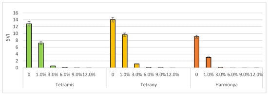 Seed vigor represents a single concept that reflects numerous characteristics and was proposed to determine the seed quality and to uniform the emergence potential of plants in the field under a variable range of environments [48]. It is influenced by multiple factors in real agricultural conditions, i.e., species, genotype, and environmental properties, but it is widely used in controlled laboratory experimental conditions. Two tetraploid varieties had better SVI values both in the control and in the induced drought variants when compared to the diploid variety Harmoniya. Tetrany was found have the most vigor, as its SVI values ranged from 14 to 0.004 (Figure 3).