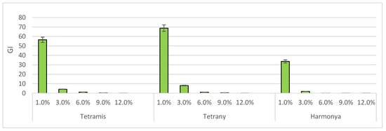 The results (Table 2) indicate that the seed germination in the experimental variants decreased with increasing sucrose concentrations (relative to Factor B). Germination percentage (GP) varied from 2.5% to 87.5% for Tetrany, from 2.5% to 85.0% for Tetramis, and from 2.5% to 72.5% for Harmoniya. All of the applied concentrations of sucrose (from 1.0 to 12.0%) had an inhibitory effect on seed germination in all of the L. perenne varieties when compared to the control (0.0%). The weakest negative effect of the 1.0% sucrose solution was found for Tetrany (GPC = 91.4%), followed by Tetramis (GPC = 82.4%), while the strongest effect of the same solution occurred in Harmoniya (GPC = 51.7%). The inhibition rate for the Tetramis variety increased in the 3% sucrose solution up to 70.6%, and after that the trend was slightly upward. The inhibition rate for the Tetrany variety also demonstrated a significant increase from 8.6% (1.0% solution) to 57.1% (3.0% solution) and to 80.0% (6.0% solution), continuously increasing to 97.1% at 12.0% solution. The Harmoniya variety exhibited a different inhibition rate, which started from 48.3% (1.0% solution), increased to 62.1% (3.0% solution), and rose to 96.6% in all other sucrose concentrations (6.0–12.0%). Our results correspond well with the findings of Cyriac et al. [58] and Waldron et al. [59], who reported that the enhancement of both osmotic and salt stresses significantly reduced seed germination in perennial ryegrass.