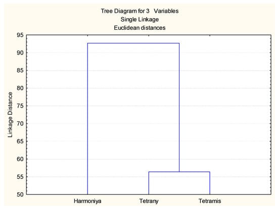 Cluster analysis was performed based on the values of all indices used, and the results are presented in Figure 5. The two tetraploid varieties (Tetrany and Tetramis) were closely linked in a cluster, while the third variety Harmoniya (diploid) was quite different in its response to drought stress in both the laboratory and the field experiments.