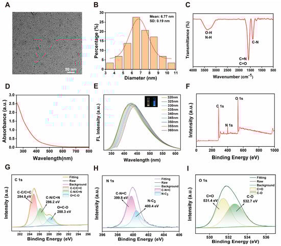 (A) TEM image of CDs, scale bar = 50 nm. (B) Size distribution of CDs. (C) FTIR spectra of CDs. (D) UV-vis absorption spectra. (E) Fluorescence emission spectra of CDs solution at different excitation wavelengths (320–360 nm) (Inset: CDs solution under daylight and 365 nm UV light). (F) XPS survey spectrum of CDs and (G–I) high-resolution C 1s, N 1s, and O 1s spectra.