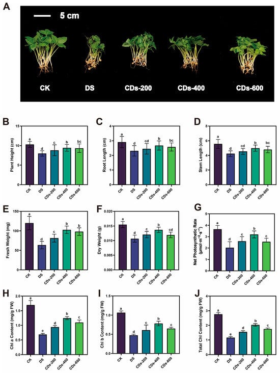 (A) Digital photos of CK, DS, and CD treatments on ginseng growth. Ginseng growth was assessed under different treatments: control (CK), drought stress (DS), and CDs at concentrations of 200, 400, and 600 μg/mL (CDs-200, CDs-400 and CDs-600). Effects of CK, DS, and CD treatments on ginseng seedlings for (B) plant height, (C) root length, (D) stem length, (E) fresh weight, (F) dry weight, (G) net photosynthetic rate, (H) chlorophyll a content, (I) chlorophyll b content, and (J) total chlorophyll content. Different letters indicate a statistically significant difference by ANOVA (p < 0.05).