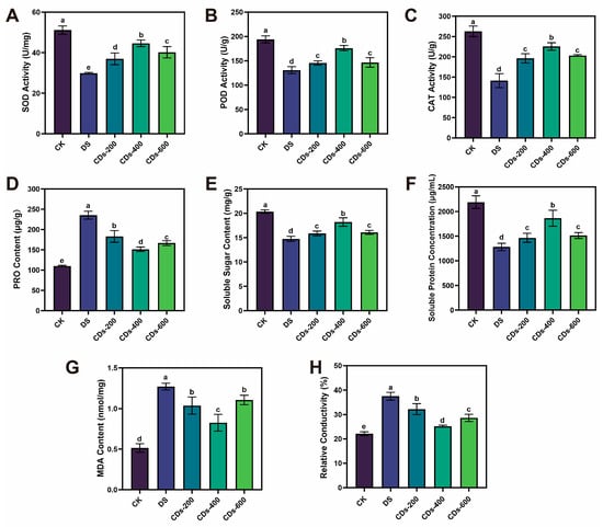 Effect of different concentration of CDs on (A) SOD, (B) POD, (C) CAT activities, (D) PRO, (E) soluble sugar, (F) soluble protein, (G) MDA content, and (H) relative conductivity. Different letters indicate a statistically significant difference by ANOVA (p < 0.05).