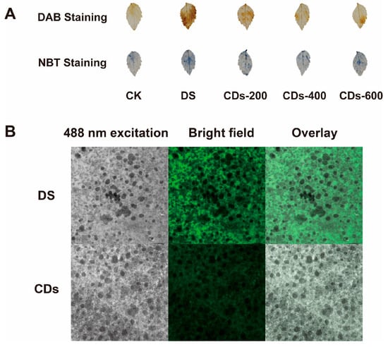 To visually confirm the ROS-scavenging efficacy of CDs in vivo, we monitored the accumulation of ROS in drought-stressed ginseng leaves using histochemical staining and fluorescent probes. Firstly, the accumulation of ROS in drought-stressed ginseng leaves was visualized using histochemical staining with 3,3′-diaminobenzidine (DAB) and nitroblue tetrazolium (NBT). The DAB staining enabled visualization of H2O2 accumulation via the formation of brown precipitates resulting from peroxidase-mediated oxidation reactions. Similarly, NBT staining detected the O2•− through its reduction to an insoluble blue formazan product, visually indicating O2•− levels in leaf tissues. As shown in Figure 5A, leaves treated with CDs exhibited markedly reduced staining compared to DS group. This was evidenced by much lighter yellowish-brown DAB deposits (indicating H2O2) and blue NBT formazan deposits (indicating O2•−), with minimal chromogenic intensity observed at the 400 μg/mL concentration. These results indicated that CD treatment reduced the accumulation of H2O2 and O2•− in ginseng leaves under drought stress.