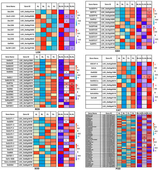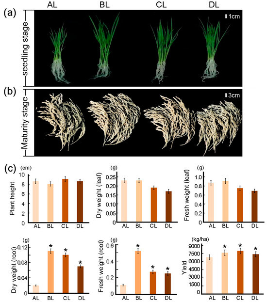 Oryza sativa L. cv. Jijing129) seedlings, we conducted a seedling-stage lighting experiment on the rice cultivar Jijing129 in a greenhouse using an LGI-660/450 dual-wavelength semiconductor laser system. The experimental design included a natural light control (AL) and three laser treatment groups, with red: blue (R:B) ratios and corresponding photon flux densities as follows: BL (50:50; 150:150 μmol m