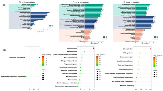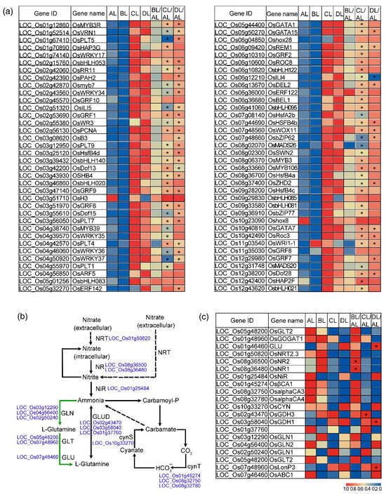 −1). We systematically analyzed short-term morphological, physiological, and gene expression changes to elucidate the potential mechanisms underlying yield enhancement under different laser spectra. The results indicated that, compared to AL, all laser treatments (BL, CL, and DL) significantly increased root fresh weight, dry weight, and nitrogen content in seedlings. Furthermore, the final yield was significantly improved in all laser-treated groups, with the CL treatment exhibiting the highest yield. Transcriptome sequencing identified 10,497, 10,441, 10,700, and 10,757 expressed genes in the AL, BL, CL, and DL groups, respectively. Comparative analysis revealed 101, 1645, and 2247 differentially expressed genes (DEGs) in the BL/AL, CL/AL, and DL/AL comparisons, respectively. Gene Ontology (GO) enrichment analysis showed that these DEGs were significantly enriched in pathways such as metabolic processes, nitrogen metabolism, and protein amino acid phosphorylation. Notably, genes involved in the regulation of nitrogen compound metabolism were significantly upregulated in the CL and DL treatments. Further analysis of nitrogen metabolism and photosynthesis pathways revealed that laser irradiation induced the upregulation of specific genes. Interestingly, although physiological assays showed no significant changes in CAT, SOD, and POD activities, the expression of their corresponding genes was upregulated by laser treatment, suggesting these genes play a regulatory role during the supplemental lighting process. Therefore, our results indicated that laser supplemental lighting during the rice seedling stage increased the nitrogen content in plants and modulated the expression of related genes, and these changes might have been associated with the subsequent increase in rice yield. This study lays a foundation for understanding the molecular mechanisms of laser supplemental lighting and provides empirical support for the application of laser technology as an effective light source in agriculture.