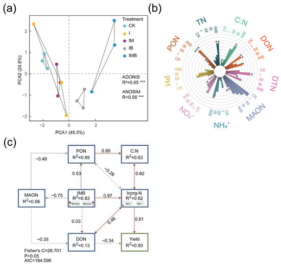 Principal component analysis (PCA) revealed significant differences in nitrogen components in the rhizosphere of border rows under different fertilization treatments (p < 0.001; Figure 2a). The greater the degree of separation of each sample in the figure, the more pronounced the classification effect between treatment groups and the more reliable the grouping factor. The IB, IM, and IMB treatments were distinctly separated from the CK treatment along the PCA1 axis (Figure 2a). This indicates that biochar and composted manure synergistically significantly altered the spatial distribution structure of nitrogen components.