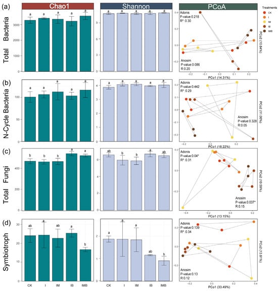 Diversity analysis of rhizosphere microbial communities. (a) The Chao1 index, Shannon index, and PCoA analysis of total bacteria. (b) The Chao1 index, Shannon index, and PCoA analysis of N-cycle bacteria. (c) The Chao1 index, Shannon index, and PCoA analysis of total fungi. (d) The Chao1 index, Shannon index, and PCoA analysis of symbiotroph. All PCoA analyses based on Jaccard distance, with colors representing different treatment groups. CK, I, IM, IB, and IMB denote the conventional level of inorganic fertilizer (control), 30% reduction in inorganic fertilizer, 30% reduction in inorganic fertilizer mixed with manure, 30% reduction in inorganic fertilizer mixed with biochar, and 30% reduction in inorganic fertilizer mixed with biochar and manure, respectively. Different lowercase letters represent significant differences (0.05) between treatments. * p < 0.05.