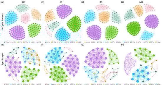 Co-occurrence network of rhizosphere soil nitrogen-cycling bacteria and symbiotic fungal communities. (a–d) are the network diagrams of nitrogen-cycling bacteria under different treatments. (e–h) are the network diagrams of symbiotic fungi under different treatments. Different colors represent different modules. CK, I, IM, IB, and IMB denote the conventional level of inorganic fertilizer (control), 30% reduction in inorganic fertilizer, 30% reduction in inorganic fertilizer mixed with manure, 30% reduction in inorganic fertilizer mixed with biochar, and 30% reduction in inorganic fertilizer mixed with biochar and manure, respectively.