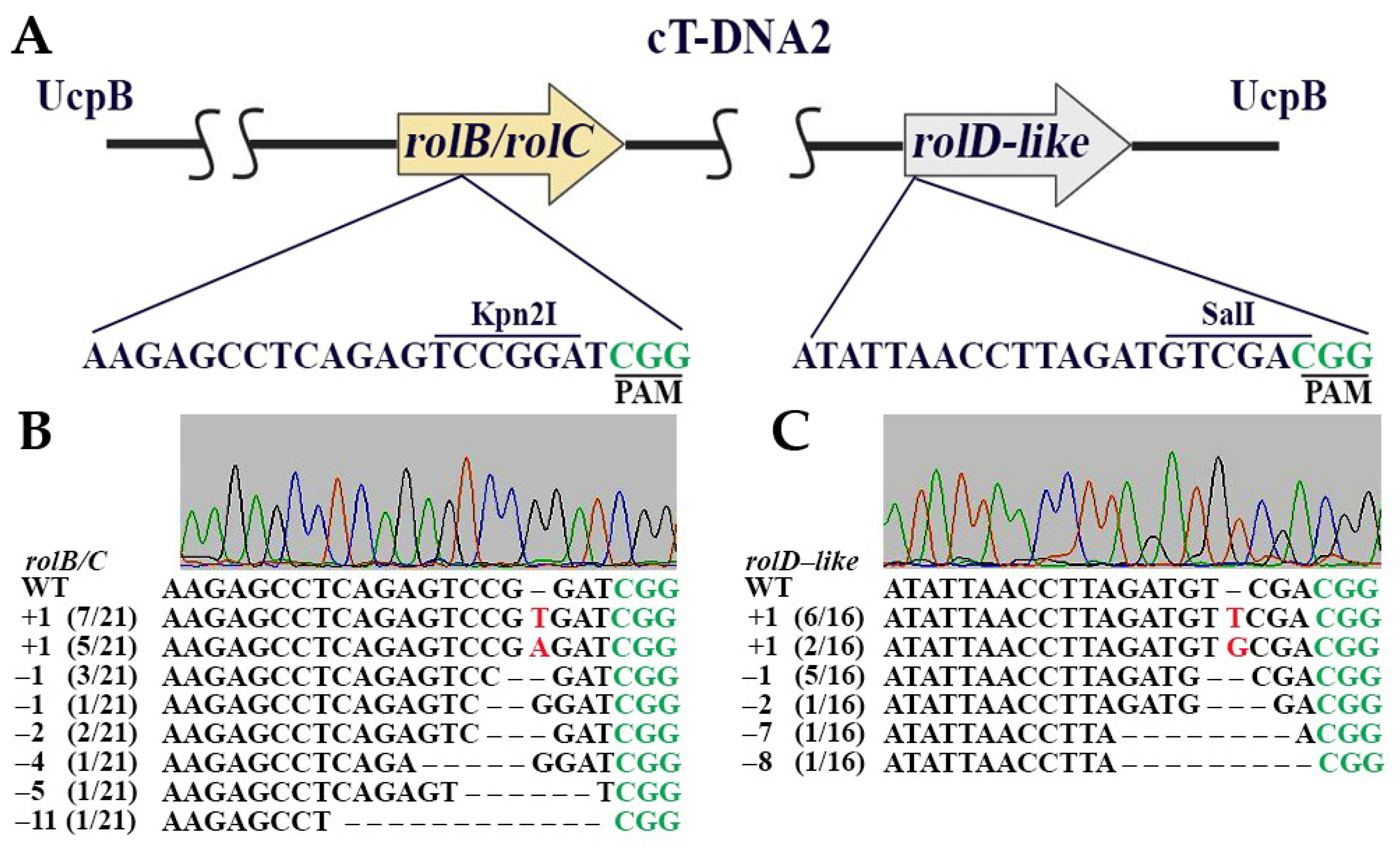 Shkryl, Y.; Yaroshenko, Y.; Grigorchuk, V.; Bulgakov, V.; Yugay, Y. Functional Analysis of Naturally Integrated Rol Genes in Sweet Potato via CRISPR/Cas9 Genome Editing. Plants 2025, 14, 3708. https://doi.org/10.3390/plants14243708