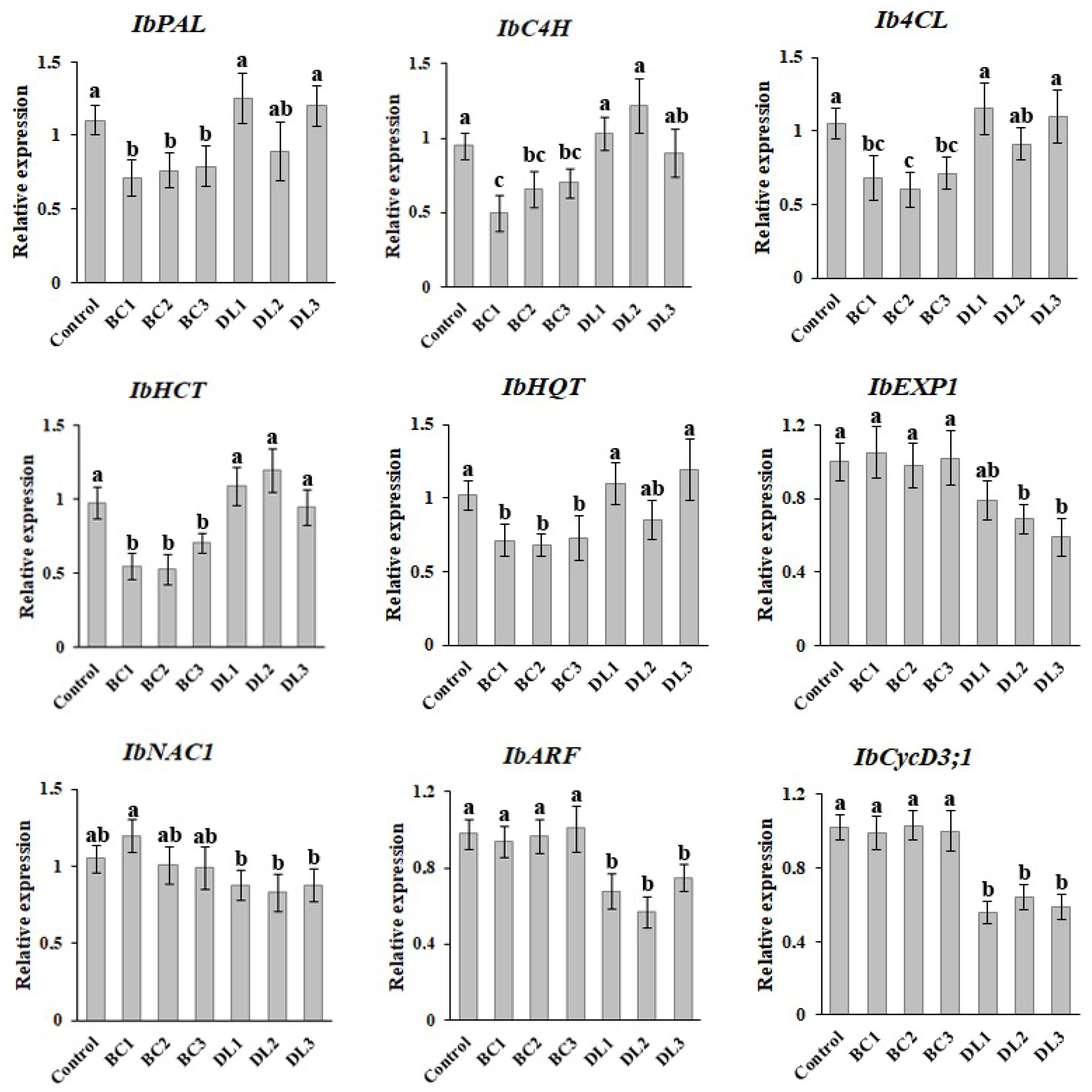 2.5. Expression Profiles of Key Biosynthetic and Growth-Related Genes in Mutant Ipomoea batatas Calli