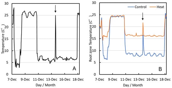 The experimental setup consisted of two treatments: ‘Heat,’ where the root zone was heated when the soil temperature dropped (Figure A3), and ‘Control,’ where the root zone remained unheated (Figure 1B). Heat treatment was performed by applying silicon rubber heaters around the unglazed clay pots. The rubber heater was controlled using a temperature controller (WT-1001, SHTROL, Xuzhou, China), and the temperature sensor of the controller was placed in the center of the unglazed clay pots. Furthermore, silicon rubber was wrapped around the outside of the unglazed clay pots to keep the root-zone temperature stable (Figure A4).