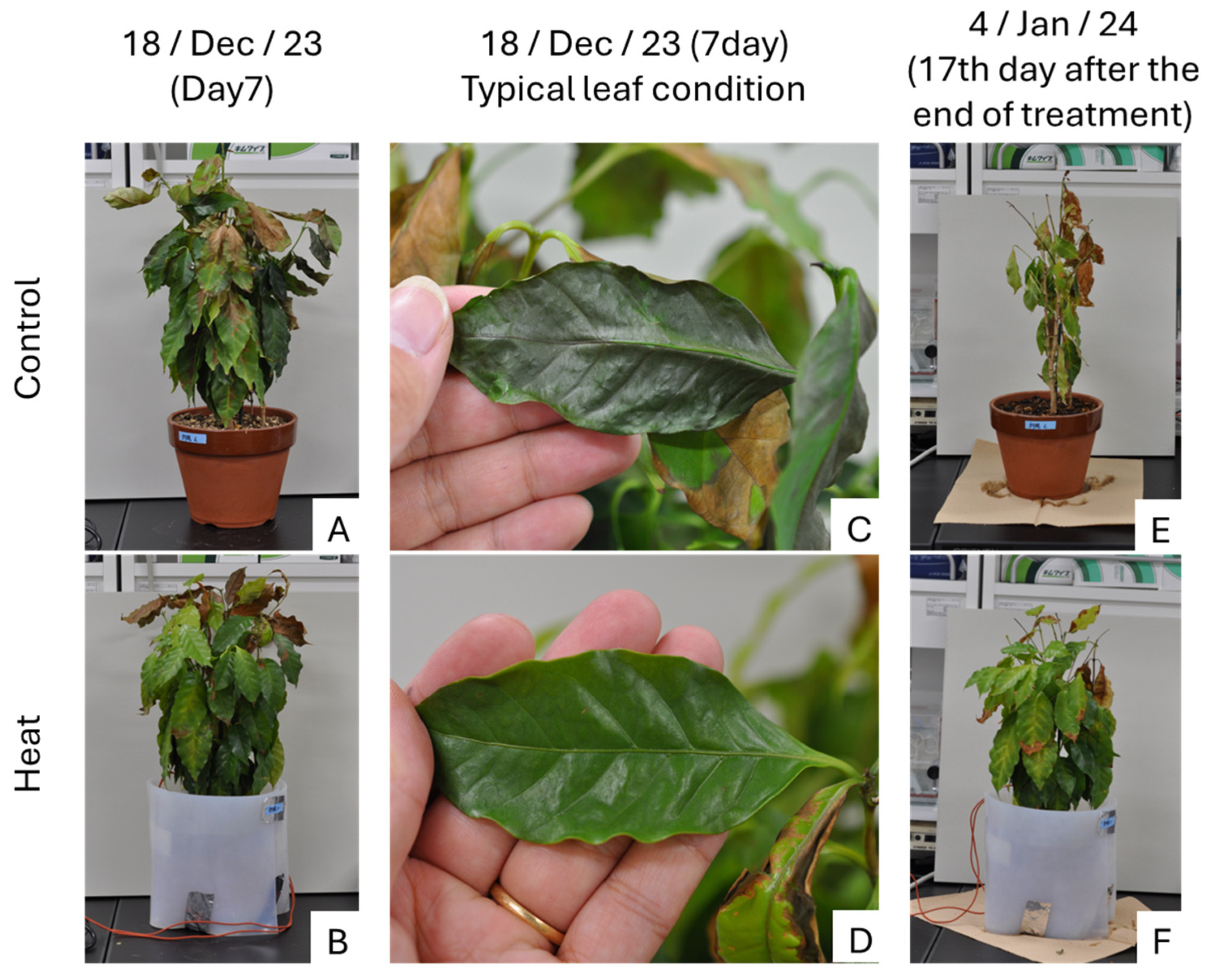 Chicago/Turabian StyleSuganami, Mao, Akira Saeki, Naoto Iwasaki, and Daisuke Takata. 2025. "Does Root-Zone Heating Mitigate the Cold Injury in Coffee Tree (Coffea arabica)?" Plants 14, no. 24: 3715. https://doi.org/10.3390/plants14243715