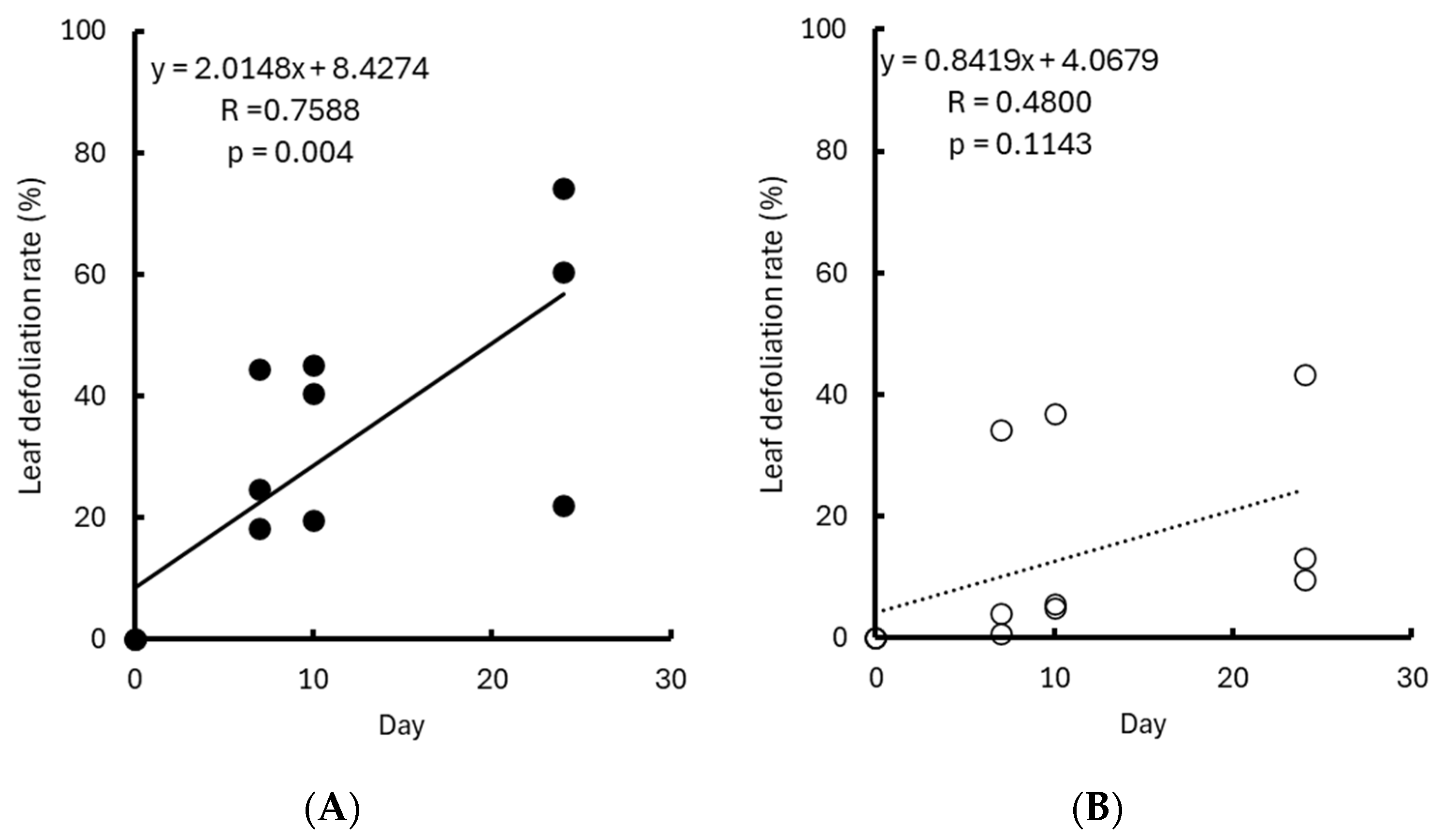 | Leaf defoliation rate | −0.3058 (p = 0.5556) | 0.2010 (p = 0.7026) | −0.7366 (p = 0.0949) | 1 | |