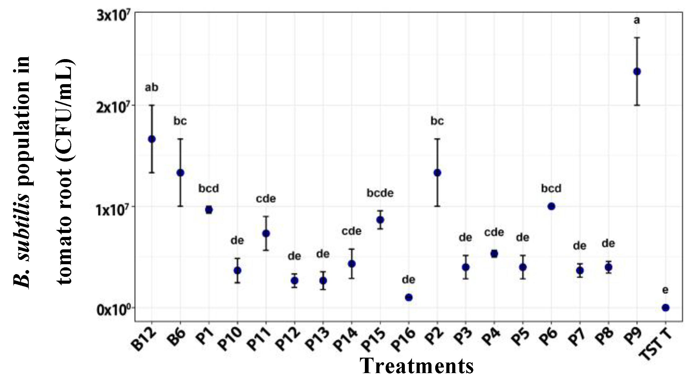 4.4. Evaluation of Root Films for the B. subtilis Establishment on Tomato Roots