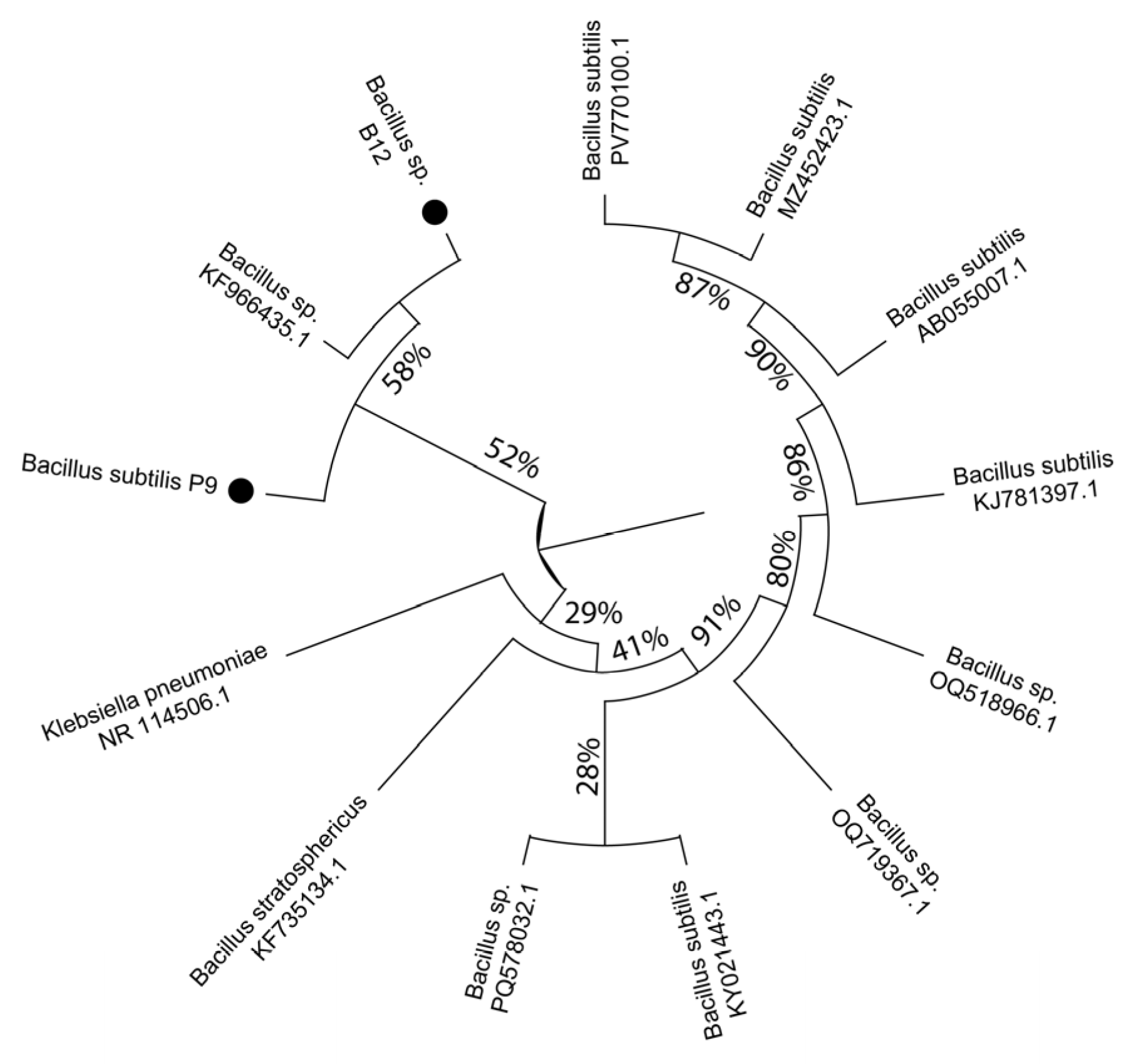 2.6. Molecular and Phylogenetic Analysis of B. subtilis Isolated from Tomato Root