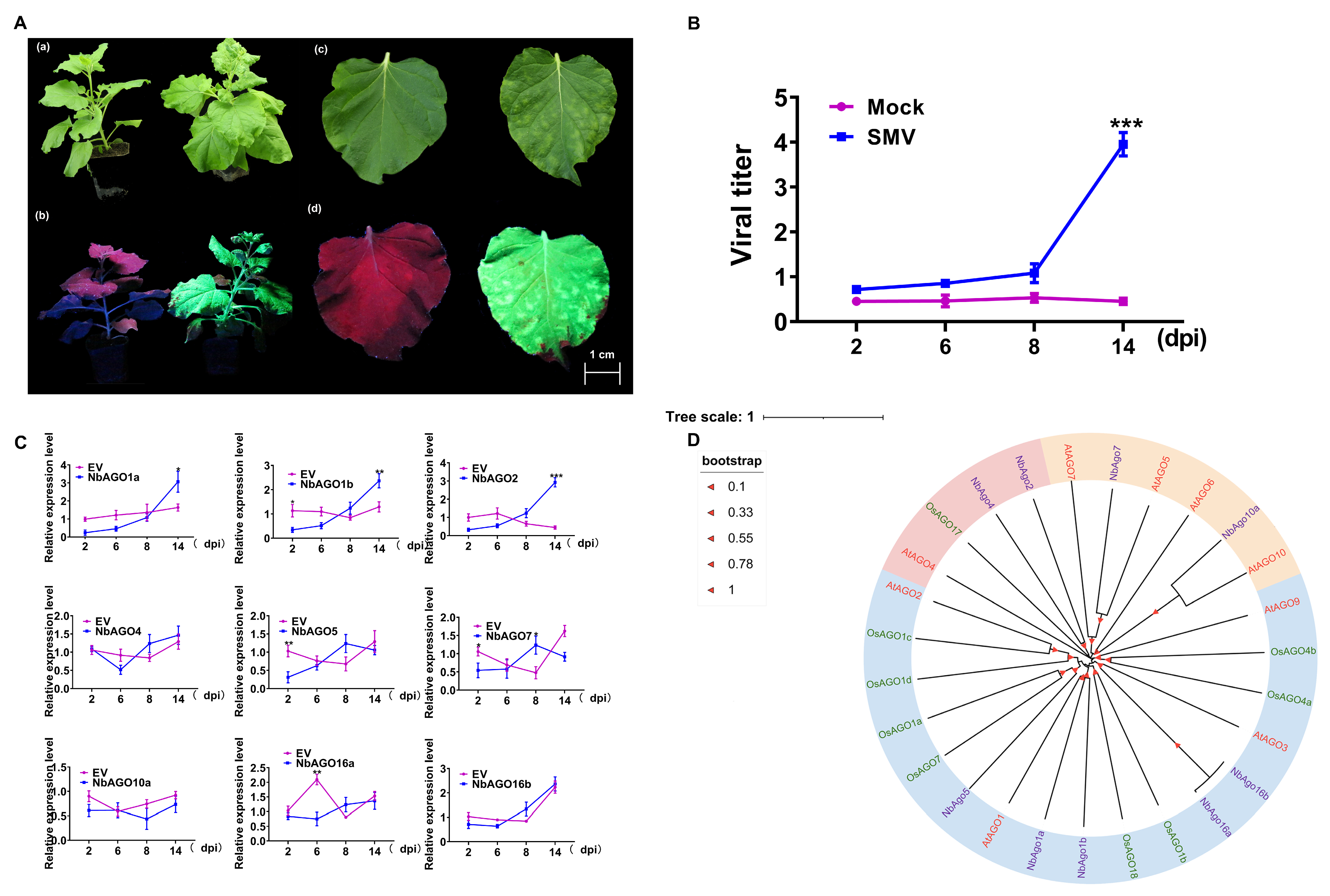 2.1. Symptoms of SMV-GFP Infection and Expression Response of NbAGOs Genes in Nicotiana benthamiana