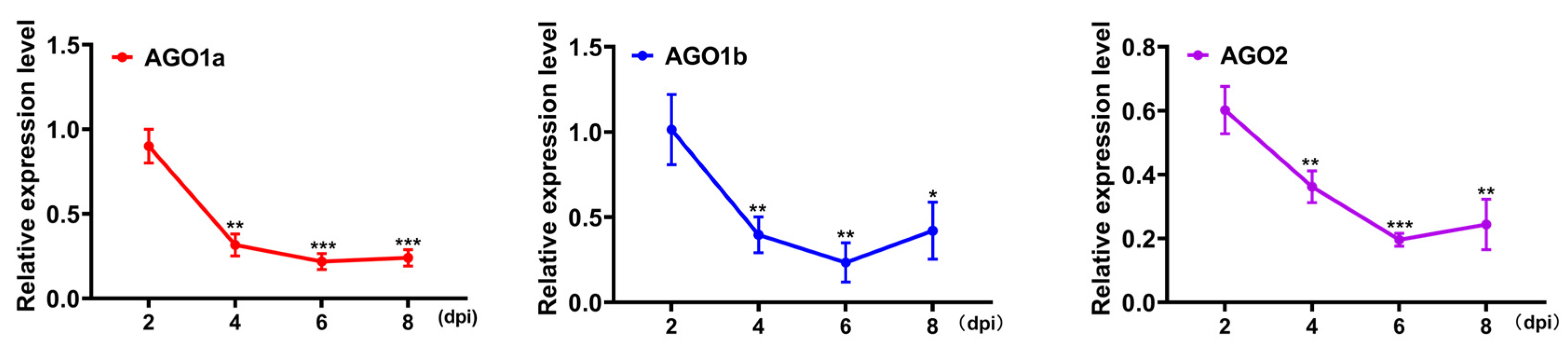 - Morel, J.B.; Godon, C.; Mourrain, P.; Beclin, C.; Boutet, S.; Feuerbach, F.; Proux, F.; Vaucheret, H. Fertile hypomorphic ARGONAUTE (ago1) mutants impaired in post-transcriptional gene silencing and virus resistance. Plant Cell 2002, 14, 629–639. [Google Scholar] [CrossRef]