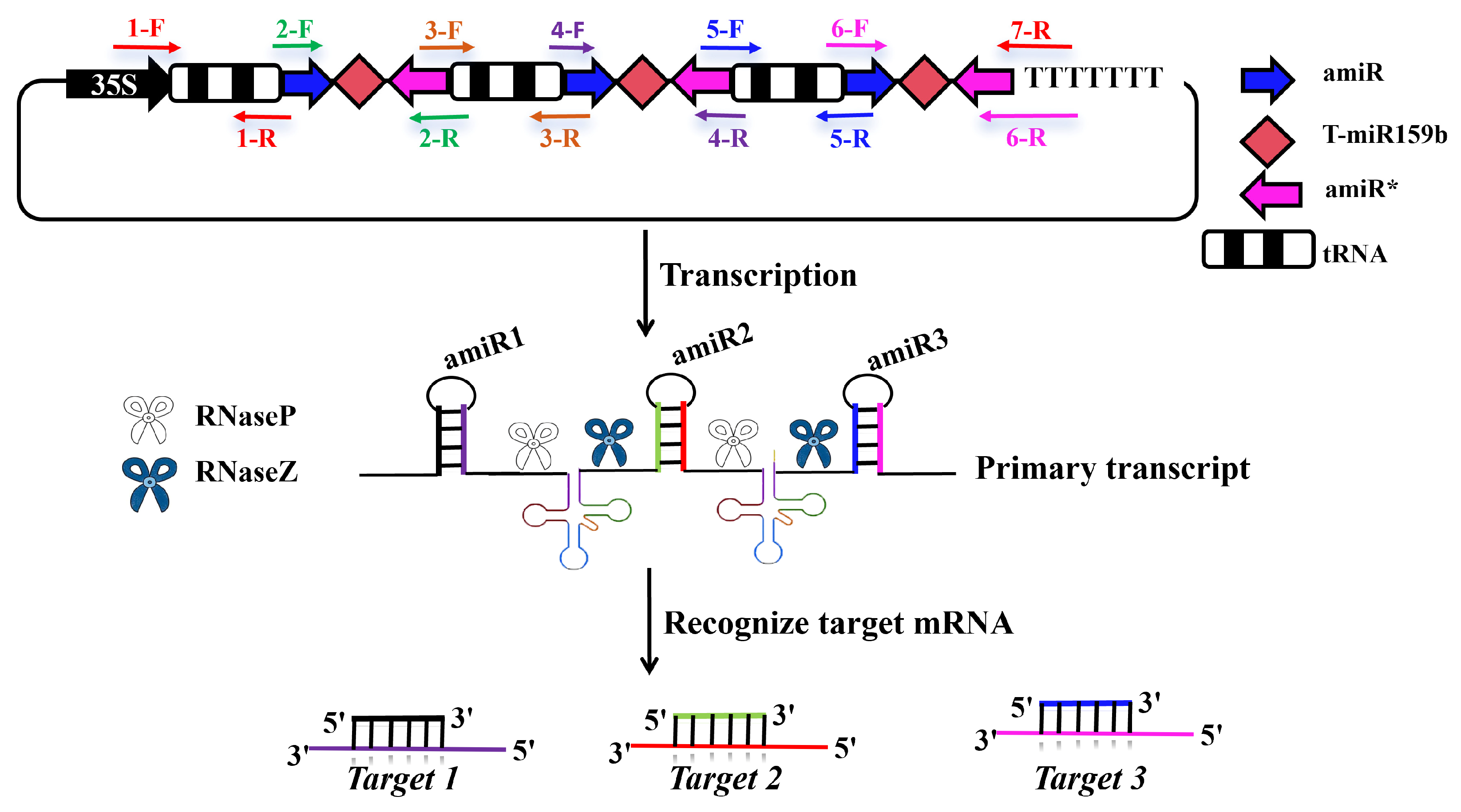 - Zhang, N.; Zhang, D.; Chen, S.L.; Gong, B.Q.; Guo, Y.; Xu, L.; Zhang, X.N.; Li, J.F. Engineering Artificial MicroRNAs for Multiplex Gene Silencing and Simplified Transgenic Screen. Plant Physiol. 2018, 178, 989–1001. [Google Scholar] [CrossRef]