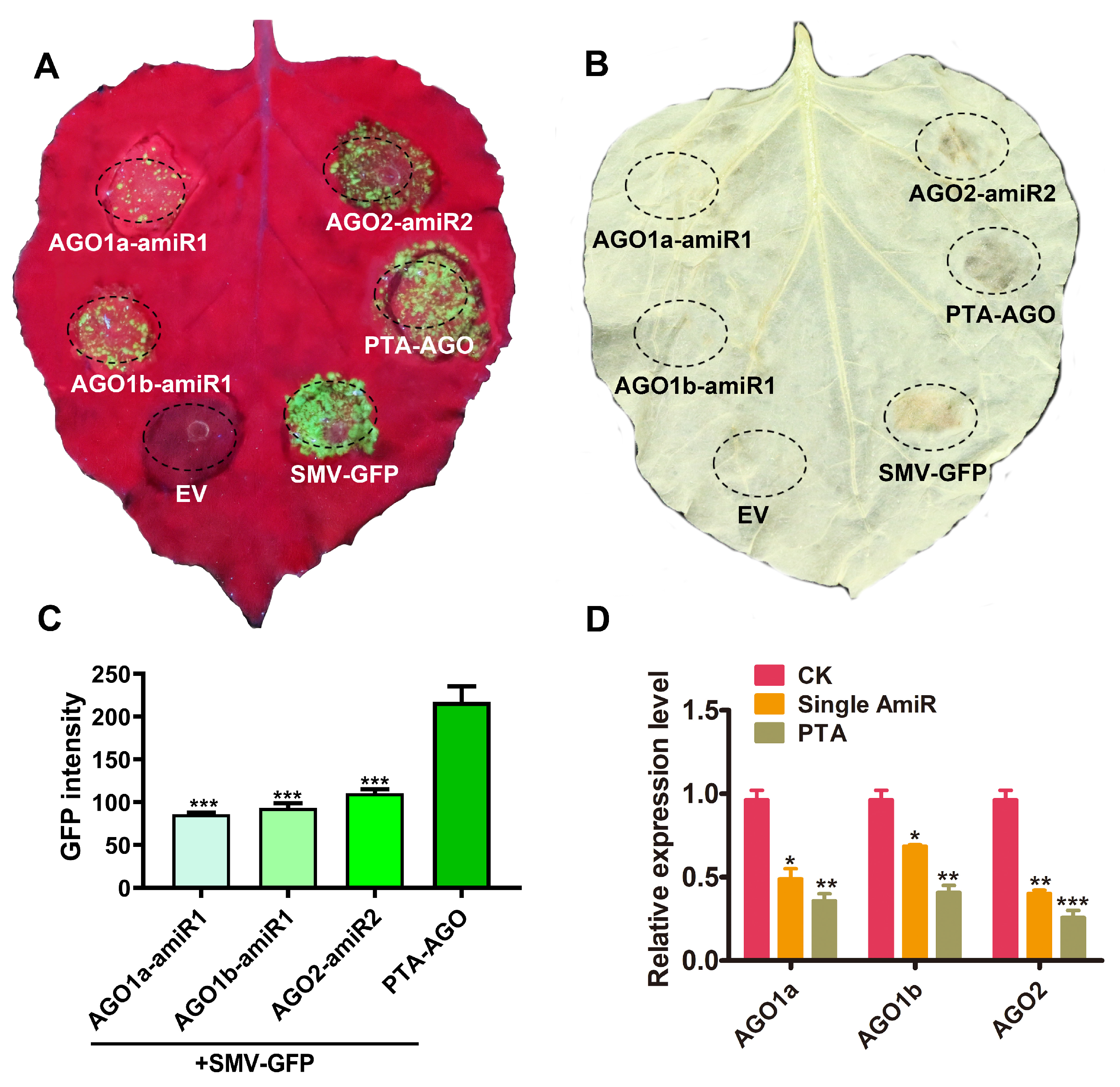 A Polycistronic tRNA-amiRNA System Reveals the Antiviral Roles of NbAGO1a/1b/2 Against Soybean mosaic virus Infection