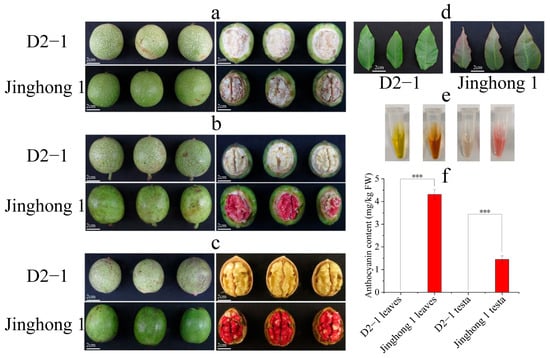 Phenotypic traits and anthocyanin content of ‘D2-1’ and ‘Jinghong 1’ walnut young leaves and testa. (a) Phenotypic traits of walnut fruits in the green fruit stage. (b) Phenotypic traits of walnut fruits in the testa color transition stage. (c) Phenotypic traits of walnut fruits in the ripening stage. (d) Phenotypic traits of young leaves in ‘D2-1’ and ‘Jinghong 1’ walnuts. (e) Anthocyanin extract from young leaves and testa (in the ripening stage) of ‘D2-1’ and ‘Jinghong 1’. From left to right, they represent young leaves of ‘D2-1’, young leaves of ‘Jinghong 1’, the testa of ‘D2-1’, and the testa of ‘Jinghong 1’. (f) Anthocyanin content in young leaves and testa (in the ripening stage) of ‘D2-1’ and ‘Jinghong 1’. *** represents a highly significant difference in anthocyanin content between samples.