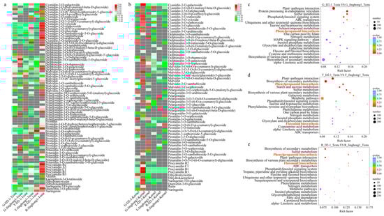 Differential genes and metabolites in the testa of ‘D2-1’ and ‘Jinghong 1’. (a) The differential metabolites between the testa of ‘D2-1’ and ‘Jinghong 1’. (b) The differential metabolites between the kernel of ‘D2-1’ and ‘Jinghong 1’. G, T, and R represent the green fruit, testa color transition, and ripening stages, respectively. (c–e) The KEGG enrichment results of differentially expressed genes in the testa of ‘D2-1’ and ‘Jinghong 1’ in the green fruit (G), testa color transition (T), and ripening (R) stages, respectively.