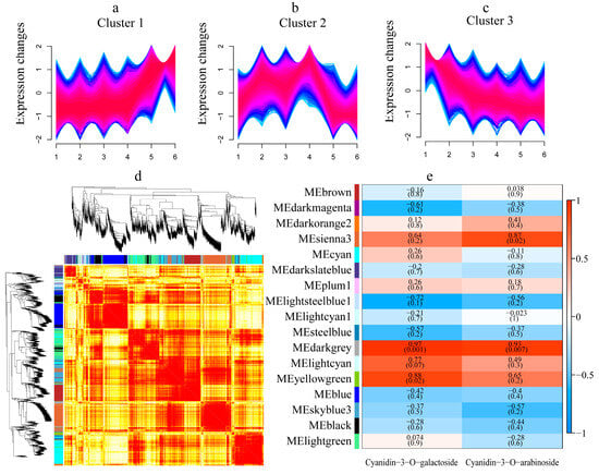 Time series analysis and WGCNA results. (a–c) represented cluster 1~cluster 3, respectively. 1~2, 3~4, and 5~6 represented ‘D2-1’ testa and ‘Jinghong 1’testa in the green fruit, testa color transition, and ripening stages, respectively. (d) Gene cluster dendrogram and the correlation between modules. (e) The correlation between modules and anthocyanin content. The number above represented the coefficient, and the number below represented R2 value. Red represents positive correlation, while blue represents negative correlation.