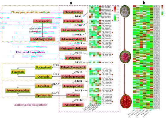 Expression characteristics of anthocyanin biosynthesis pathway structural genes (a) and JrMYB transcription factor (b). G, T, and R represent green fruit, testa color transition, and ripening stages, respectively. Red triangles in the figure represent the selected key differentially expressed genes.
