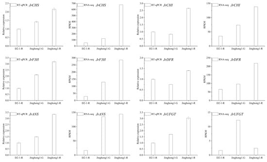 Phenylpropanoid biosynthesis is the starting point of anthocyanin biosynthesis, and flavonoid biosynthesis is the core pathway of anthocyanin biosynthesis [5]. In the flavonoid biosynthesis pathway, the structural genes JrPAL, JrC4H, Jr4CL (early stage), JrCHS, JrCHI, JrF3H, JrF3′H (mid stage), JrDFR, JrANS, and JrUFGT (late stage) jointly regulated anthocyanin biosynthesis. To further elucidate the regulatory mode of anthocyanin accumulation in the ‘Jinghong 1’ red testa, the expression levels of structural genes in this pathway were analyzed (Figure 4a). In the green fruit stage, JrPAL, Jr4CL, JrCHS, and JrUFGT all showed the highest number of significantly upregulated genes, with three genes each. Conversely, JrPAL showed the highest number of significantly downregulated genes, a total of four, followed by Jr4CL and JrDFR, with three each. In the testa color transition stage, JrCHS had the highest number of significantly upregulated genes, at five. While JrPAL had the highest number of significantly downregulated genes, at five. In the ripening stage, JrPAL had the highest number of significantly upregulated genes, reaching seven. Jr4CL and JrUFGT had the highest number of significantly downregulated genes, with two each. With the development of fruits, the expression level of JrPAL (LOC108988497, LOC109008959, LOC118349603), JrC4H (LOC108996947, LOC109002391), Jr4CL (LOC108998277), JrCHS (LOC108988452), JrCHI (LOC108996546, LOC109007666), JrF3′H (LOC109011206, LOC109011249, LOC109017724), JrDFR (LOC108991381, LOC109010696, LOC109010697), and JrUFGT (LOC108998553, LOC108998554) showed the upward trend. Based on the above results, it was found that JrPAL (LOC109008959), JrC4H (LOC108996947), Jr4CL (LOC108998277), JrCHS (LOC108984452), JrCHI (LOC109007666), JrF3H (LOC108997708), JrF3′H (LOC109017724), JrDFR (LOC108991381), JrANS (LOC109010746), and JrUFGT (LOC109004490) played important roles in the formation of red testa in ‘Jinghong 1’. qRT-PCR was used to validate JrCHS, JrCHI, JrF3H, JrDFR, JrANS, and JrUFGT (Figure 5), and the results showed that the qRT-PCR results were consistent with the transcriptome results, indicating that the transcriptome results were reliable.