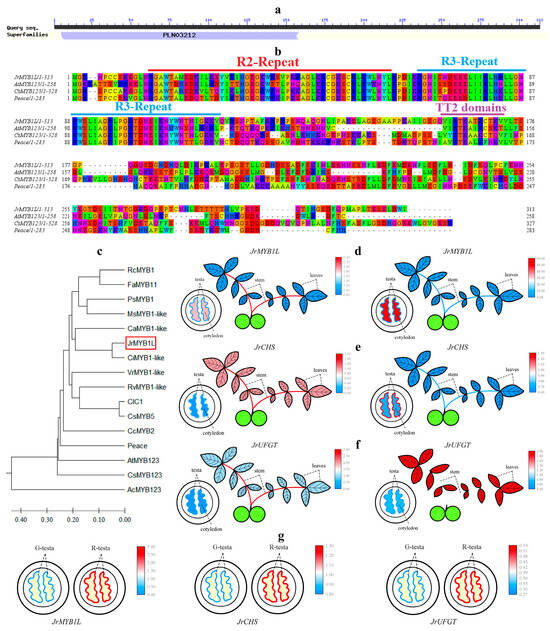 Bioinformatics analysis of JrMYB1L and tissue specificity of JrMYB1L, JrCHS, and JrUFGT. (a) Structural domain prediction results of the JrMYB1L protein. (b) Multiple sequence alignment results between JrMYB1L, AtMYB123, CsMYB123, and Peace proteins. The same color represents the homology of amino acid sequences. (c) Phylogenetic relationship between JrMYB1L and TT2 type R2R3-MYB proteins in other species. The red box represents the key gene JrMYB1L in this article. (d–f) The expression characteristics of JrMYB1L, JrCHS, and JrUFGT in different tissues of ‘D2-1’ (left) and ‘Jinghong 1’ (right). (g) The expression characteristics of JrMYB1L (left), JrCHS (middle), and JrUFGT (right) in the testa of ‘Jinghong 1’ in the green fruit (G) and ripening (R) stages. In (d–f), red represents relatively high expression levels, while red represents relatively low expression levels.