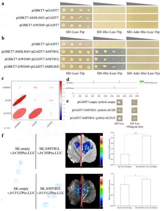 The binding of JrMYB1L interacting proteins and their downstream target genes. (a) Self-activation of JrbHLH42 and JrWD40 proteins. (b) Y2H confirms the interaction between JrMYB1L, JrbHLH42, and JrWD40 proteins. (c) The correlation between transcription levels of JrMYB1L, JrCHS, and JrUFGT. (d) Distribution of binding sites between JrCHSpro, JrUFGTpro fragments, and JrMYB1L. (e) Y1H proves the binding of JrMYB1L with JrCHSpro and JrUFGTpro. (f) Dual-LUC demonstrates the binding of JrMYB1L with JrCHSpro and JrUFGTpro, with qualitative and quantitative analysis results from left to right. The values in f represent the means ± standard deviations of three biological replicates. Based on the results of the two-sample t-test analysis, * represents p < 0.05, and *** represents p < 0.01.