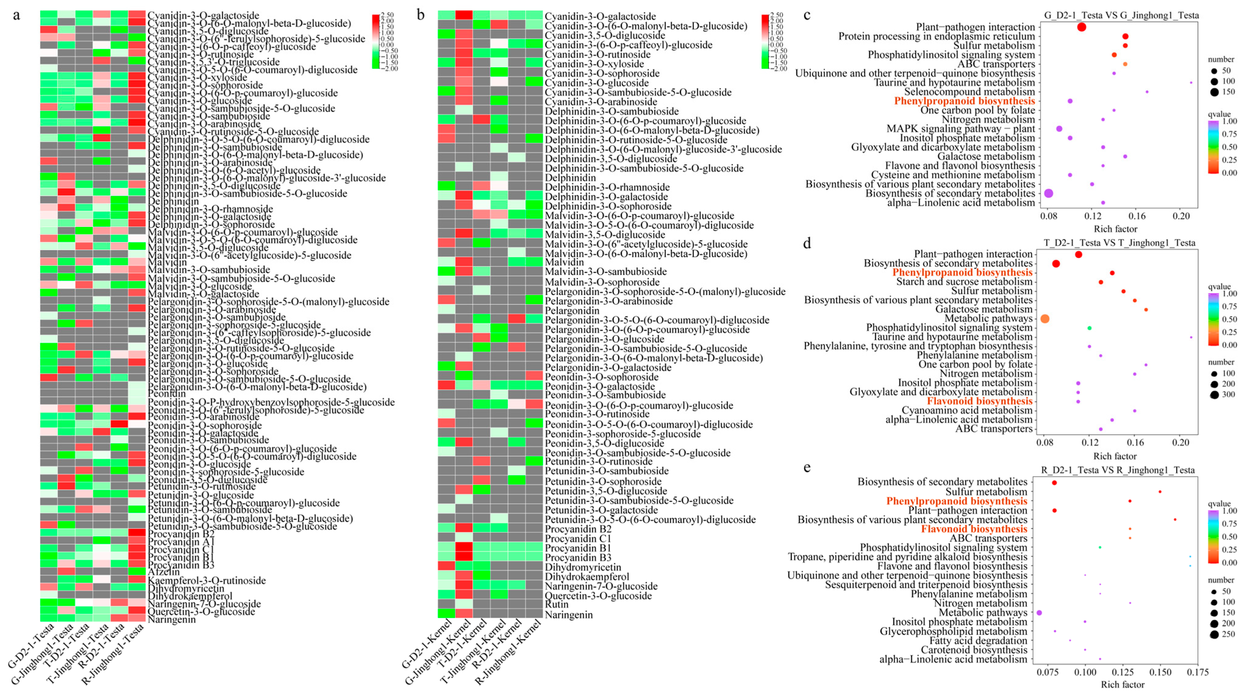 Based on the OPLS-DA model (biological replicates ≥ 3), the Variable Importance in Projection (VIP) was obtained to preliminarily screen for differential metabolites between the testa of ‘D2-1’ and ‘Jinghong 1’. The screening criteria for differential metabolites were fold change ≥ 2 and fold change ≤ 0.5, and the difference between the control group and the experimental group was ≥2 or ≤0.5.
