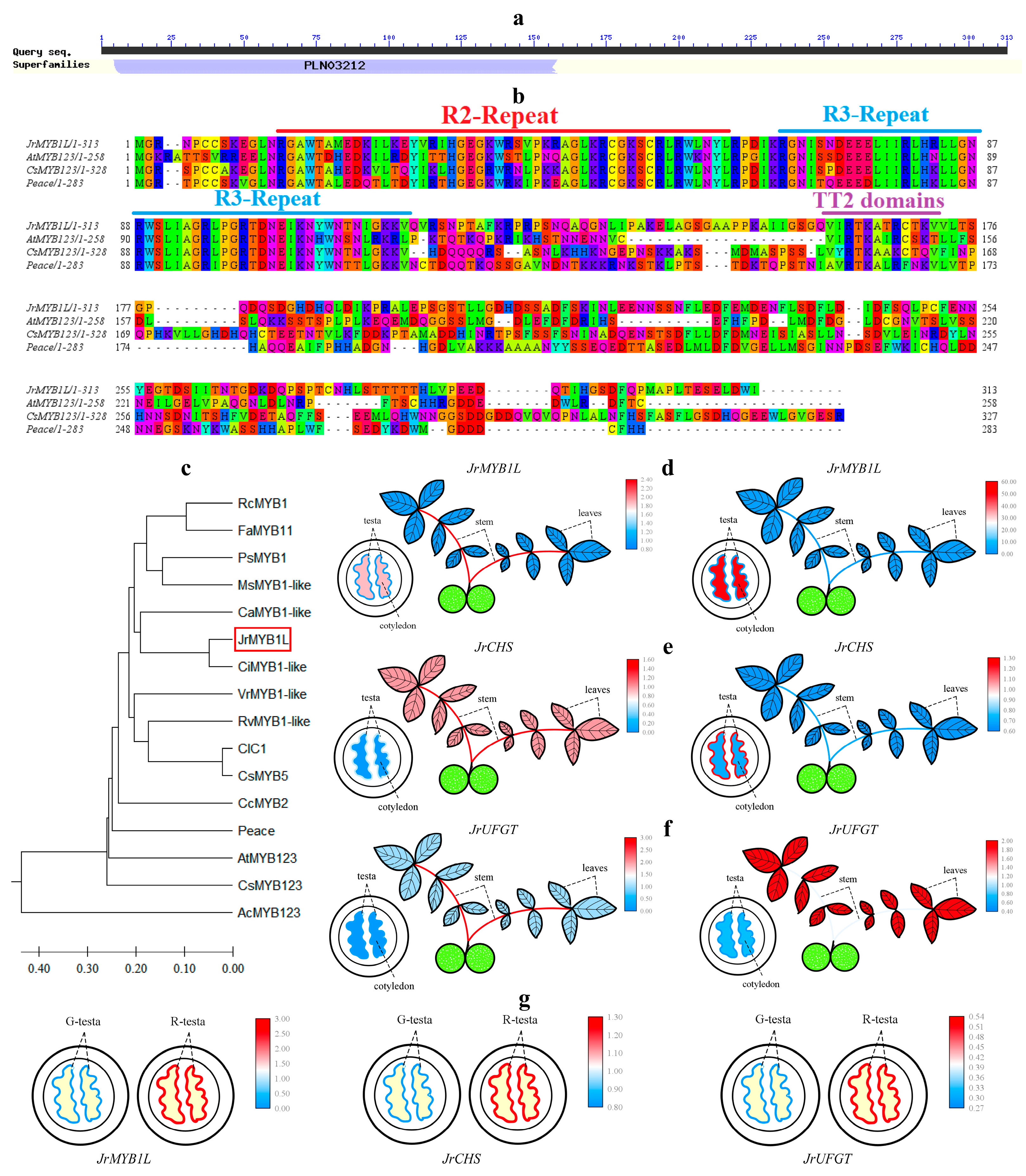 https://www.ncbi.nlm.nih.gov/Structure/cdd/wrpsb.cgi) (accessed on 8 April 2025) was used to predict the structural domains of JrMYB1L. Jalview (v2.11.2.3) and MEGA11 (v11.0.13) were used for multiple sequence alignment of JrMYB1L protein. Downloaded R2R3-MYB protein sequences of walnut JrMYB1L,