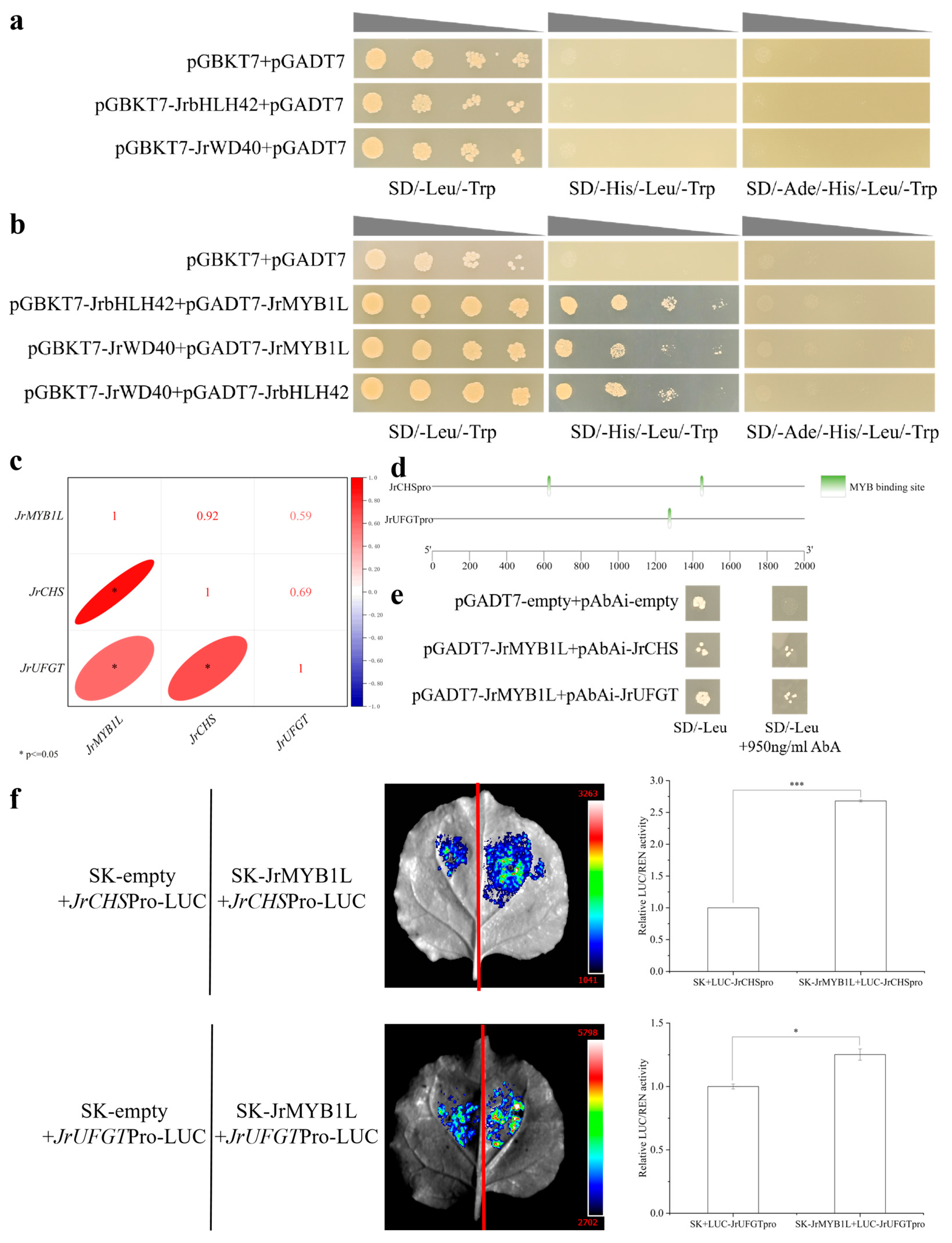 Table S10. Inserted the CDS sequences of JrMYB1L and JrbHLH42 into the pGADT7 vector separately. Transferred JrbHLH42-BD + JrMYB1L-AD, JrWD40-BD + JrMYB1L-AD, and JrWD40-BD + JrbHLH42-AD to Y2HGold competent cells separately to verify the interaction between two proteins. According to the Y2HGold Chemically Competitive Cell manual from Shanghai Weidi Biotechnology Co., Ltd. (Shanghai, China), the bait protein and prey protein were co-transformed into Y2HGold competent cells. The co-transformed bacterial solution was coated onto the two deficient medium (SD/-Trp/-Leu) and cultured at 28 °C for 2–3 days. Single colonies were then selected for expansion culture. Subsequently, the expanded bacterial solution was diluted in gradients of 10
