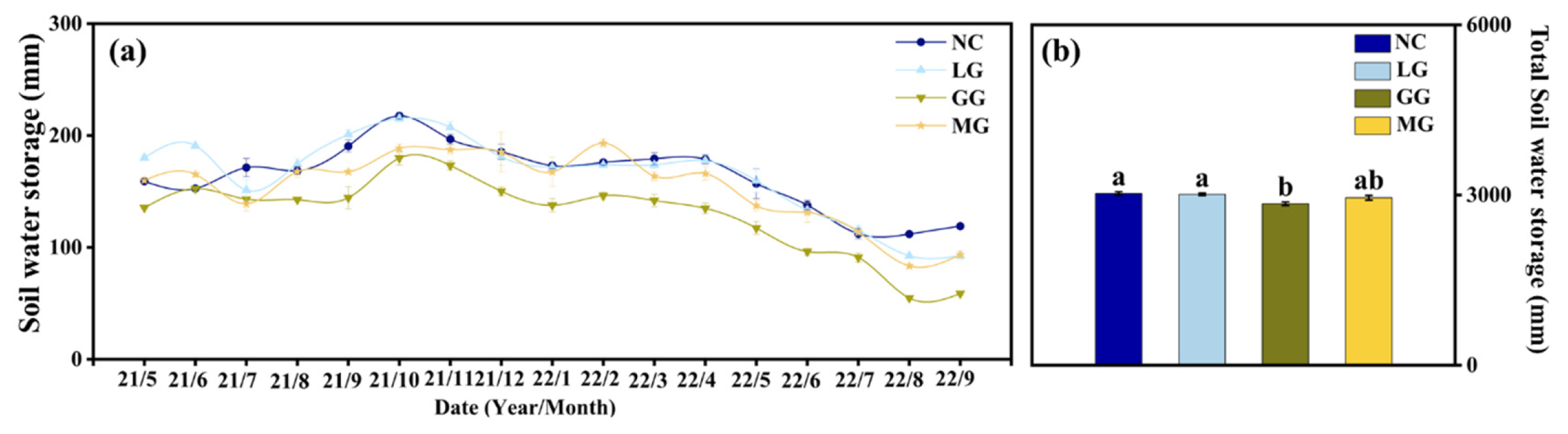 3.1. Effects of Cover Crops on Soil Water Dynamics