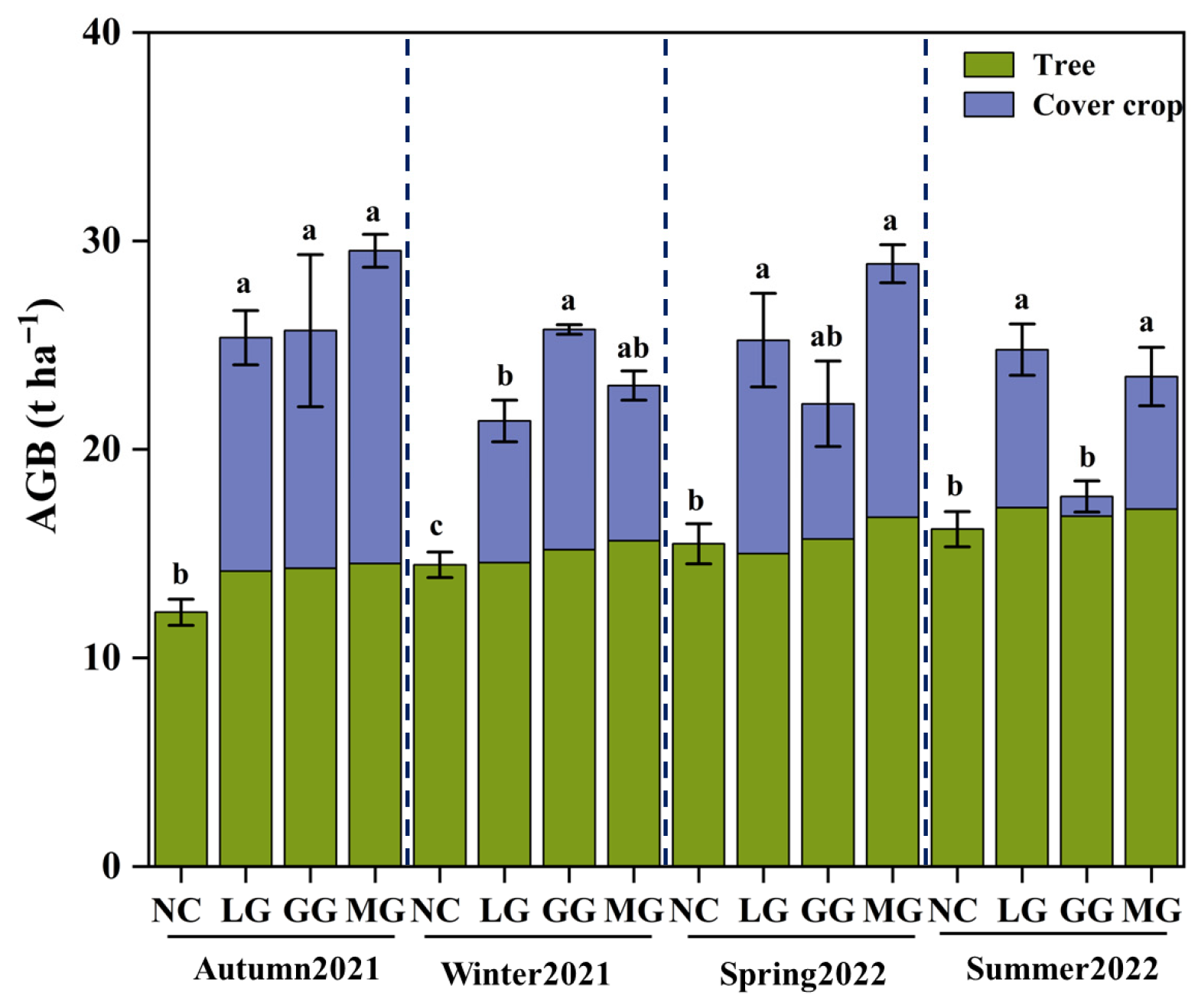2.5. Biomass Dynamics of Fruit Trees and Cover Crops