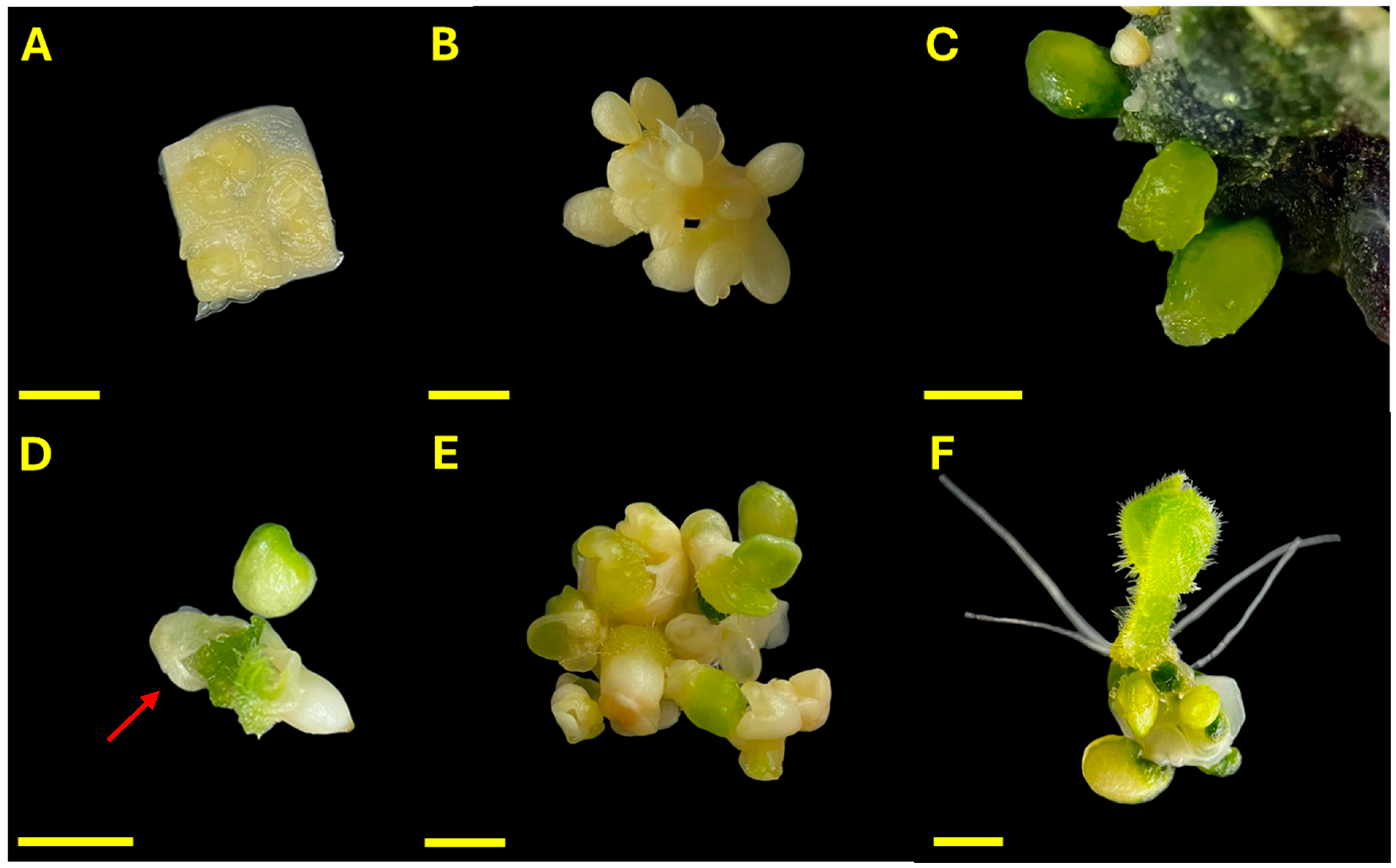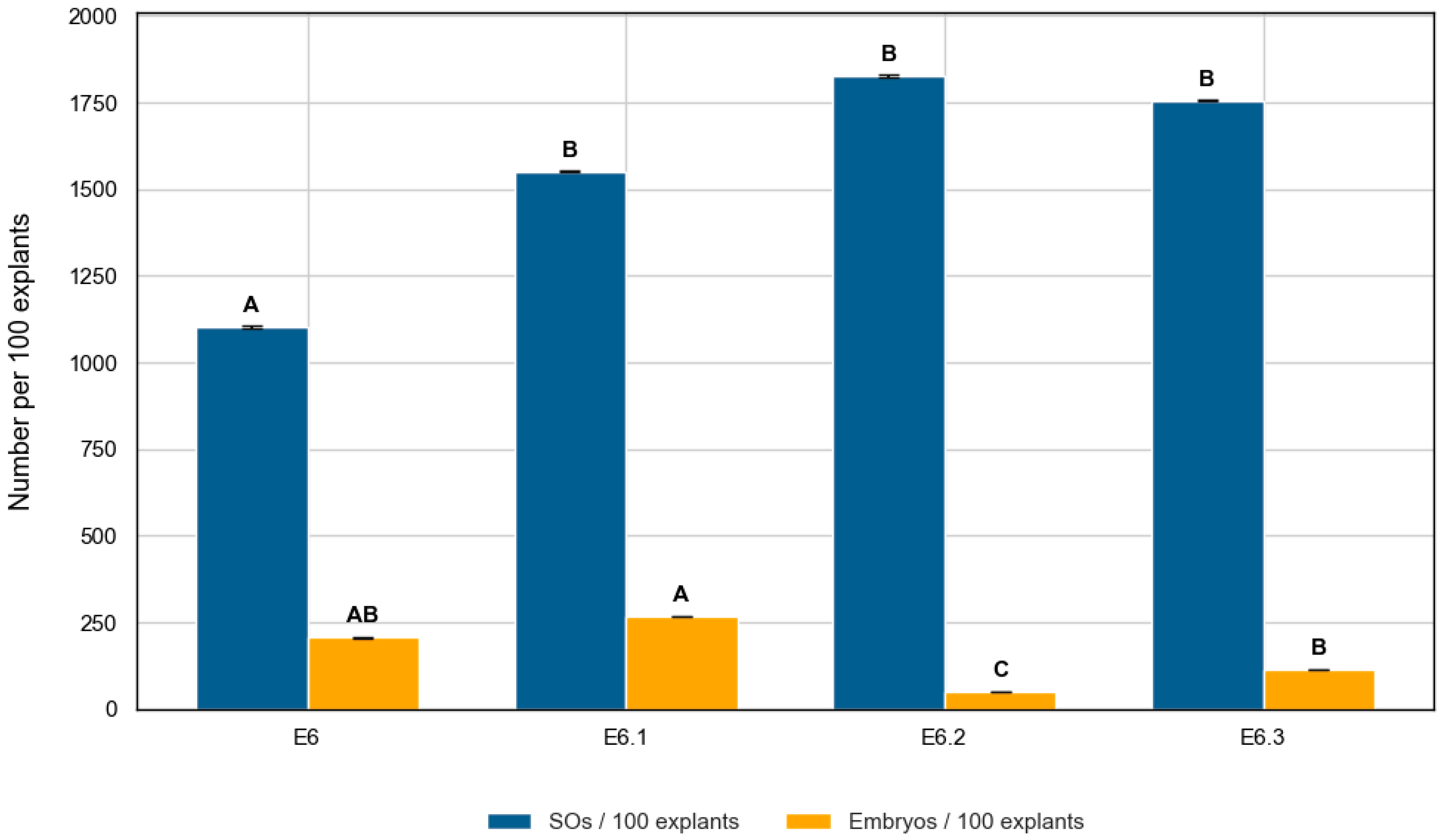 | Medium | Total Embryos | Embryos/Explant (Mean ± SD) | Embryos/100 Explants | % Explants ≥ 1 Embryo | Conversion Rate (%) |
