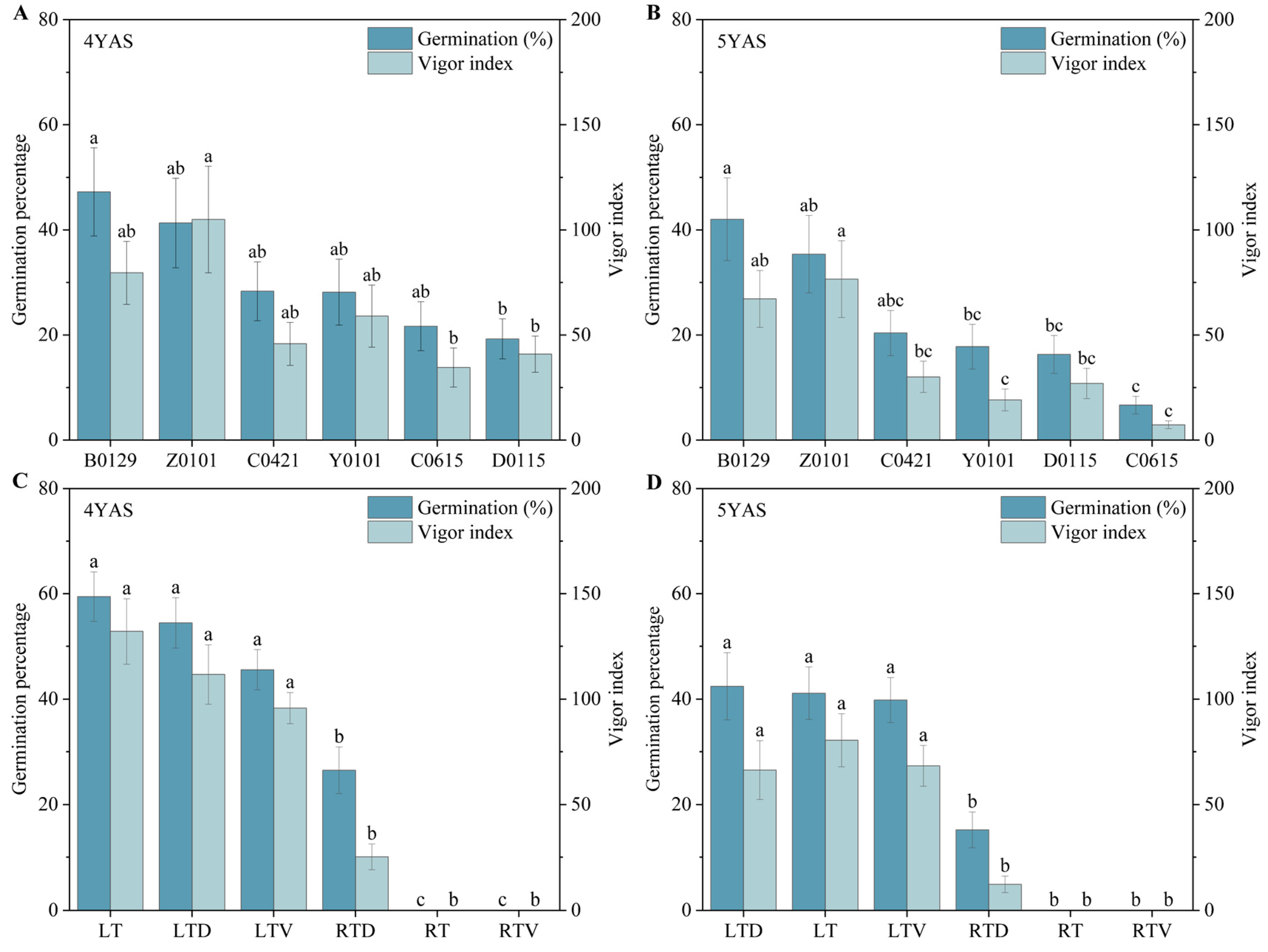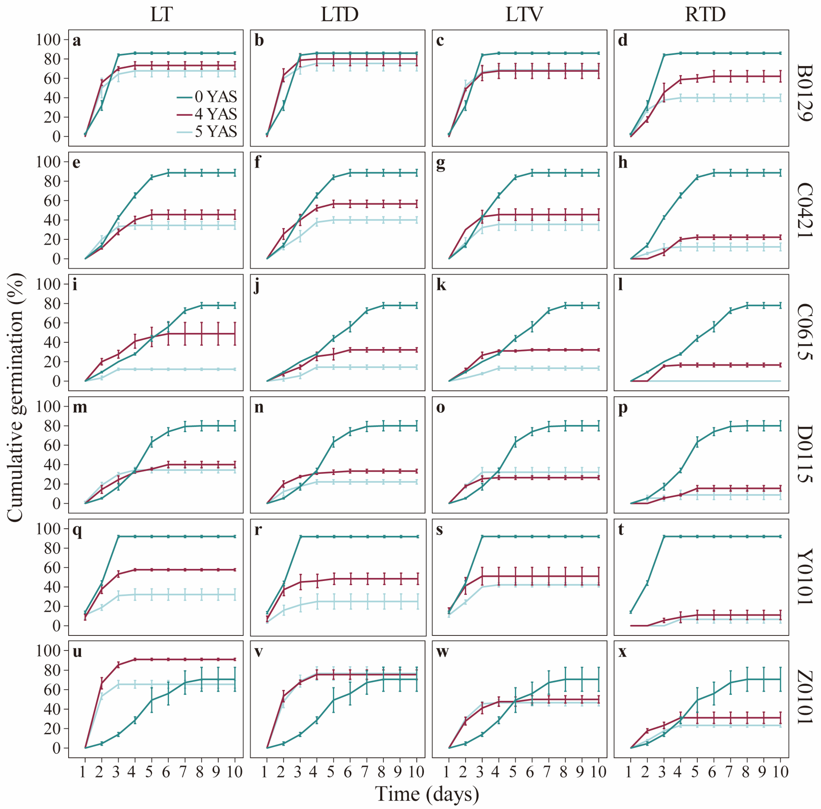 The dry seeds were placed into the centrifuge tubes with small holes in the top cover and subjected to six different storage conditions: (1) room temperature (RT), (2) room temperature with desiccant (RTD), (3) room temperature with vacuum (RTV), (4) low temperature (LT), (5) low temperature with desiccant (LTD), and (6) low temperature with vacuum (LTV) (