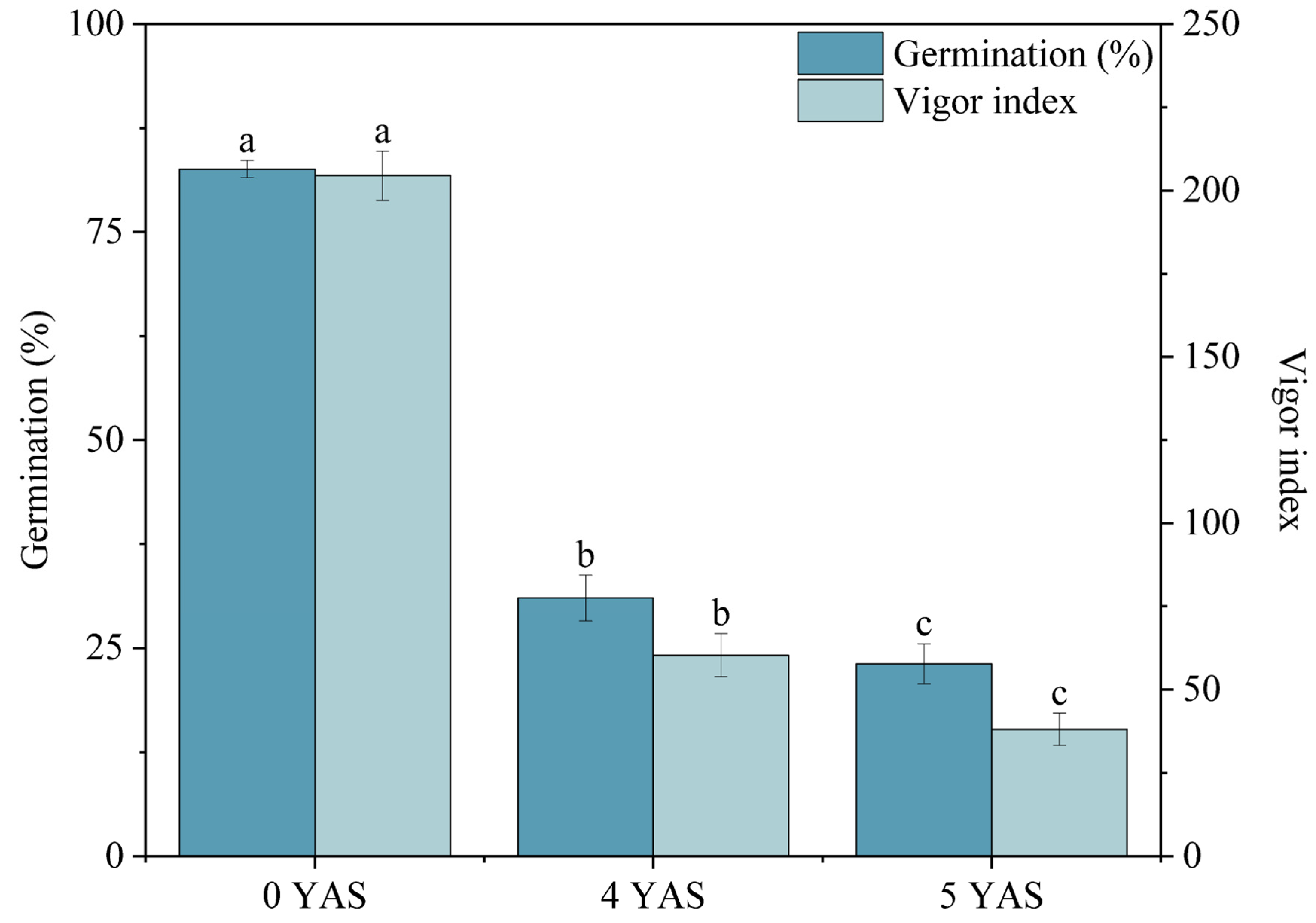 Miscanthus seeds during long-term storage, as seeds at room temperature with vacuum lost viability by the fourth year. Moreover, the germination percentage and vitality index of the seeds stored under the low temperature with vacuum conditions were the lowest among the three low-temperature storage methods. This result contrasts sharply with the benefits of vacuum storage reported in other species. For instance, Flores et al. reported that the vacuum treatment prevented a 50% reduction in the germination capacity of