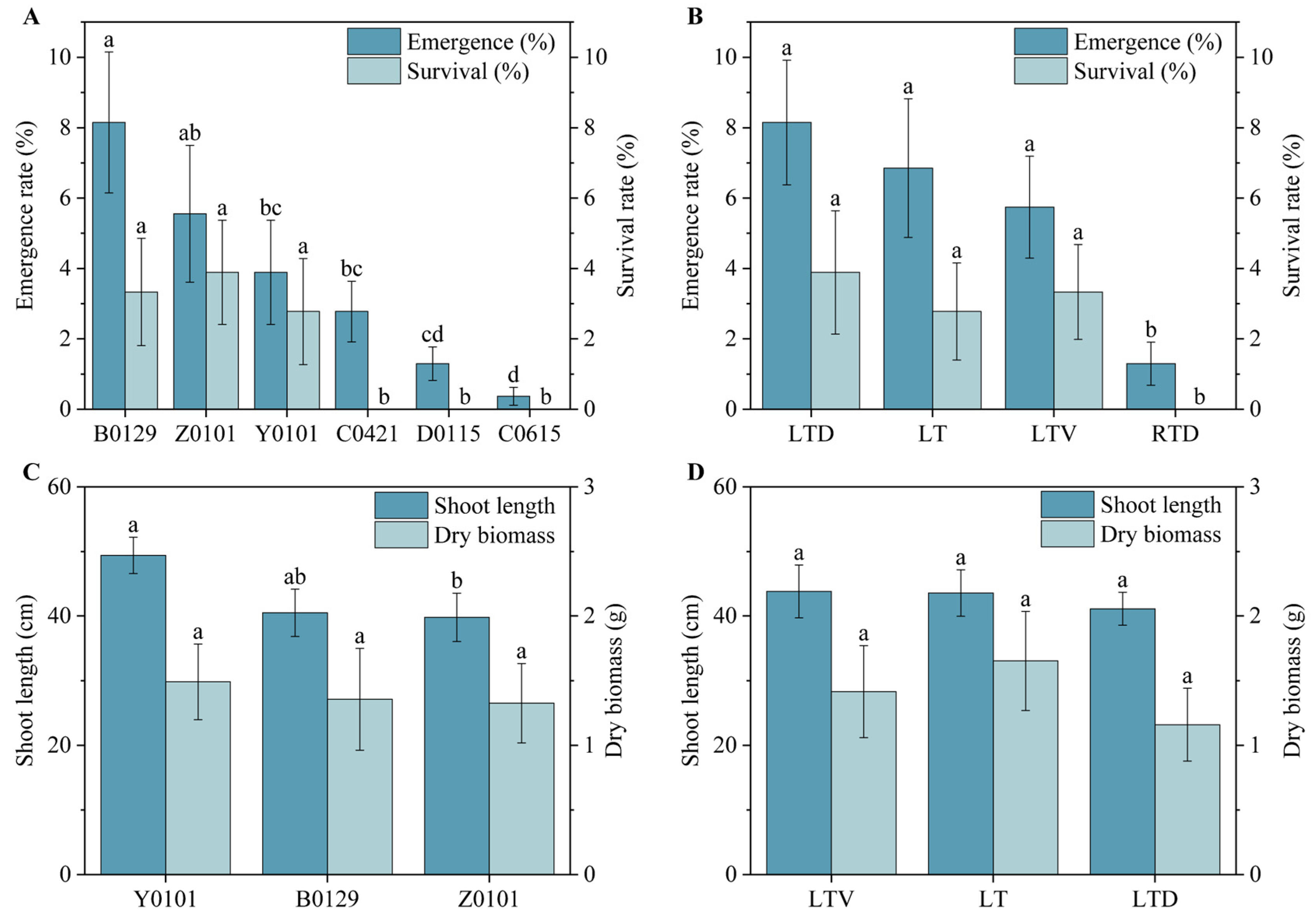 Field trials were conducted in late July 2021 at Hunan Agricultural University to evaluate the practical field establishment potential of seeds after five years of storage. The primary objective was to determine whether the viability observed in laboratory tests after extended storage translated into successful field establishment. This assessment served as the definitive test of the storage method’s practical effectiveness. The designated area was prepared for seed germination, which was divided into 108 plots, encompassing six genotypes, six storage methods, and three replications. Prior to the trial, the vegetation and litter were removed from the plots. The stored seeds from each group were randomly distributed on the plot surface, with each group consisting of 30 seeds. The regular watering every 2 d ensured the seed germination and growth. The germinated seeds were counted on the 10th day of sowing. After 60 d, all the surviving seedlings were collected, and the survival, shoot length, and dry biomass weight were measured. To determine the dry biomass weight, the seedlings were placed in a desiccator at 65 °C until a constant mass was achieved and then weighed. During the field experiment, the average highest temperature was 34.25 °C, the average lowest temperature was 25.72 °C, and total precipitation was 144.10 mm.