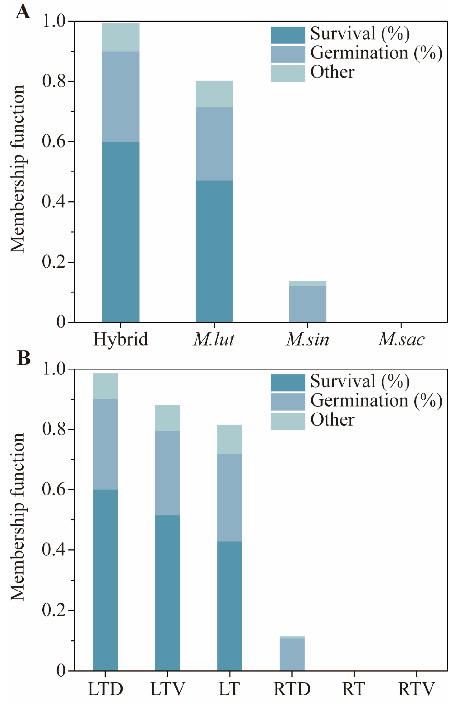 To evaluate the impact of various storage conditions on Miscanthus seeds, we employed a membership function. This study aimed to provide practical guidance for the application of Miscanthus seeds, with the particular emphasis on the field survival, which has been assigned the highest weight. Although the field survival results were not entirely satisfactory, they revealed significant differences among the different storage conditions and genotypes. Additionally, the germination percentage, a primary indicator of seed quality, was also given substantial weight in the evaluation.