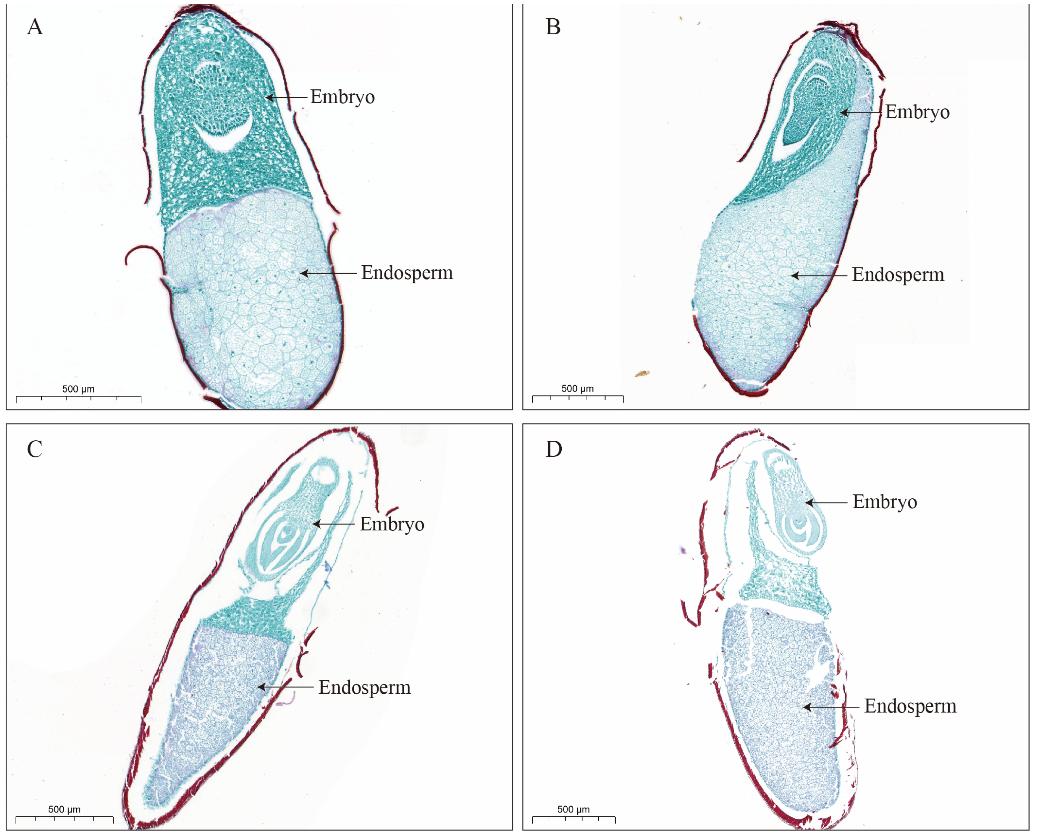 The embryo derived from a fertilized egg is the most crucial component of the seed and represents the young plant body. The cellular structure of the embryo serves as a key indicator of the physiological activity of the seed and undergoes changes as the seed ages. Among the environmental factors, relative humidity and temperature have the most direct influence on seed aging. This experiment utilized two distinct relative humidity and temperature conditions (room temperature and low temperature) for paraffin sectioning of