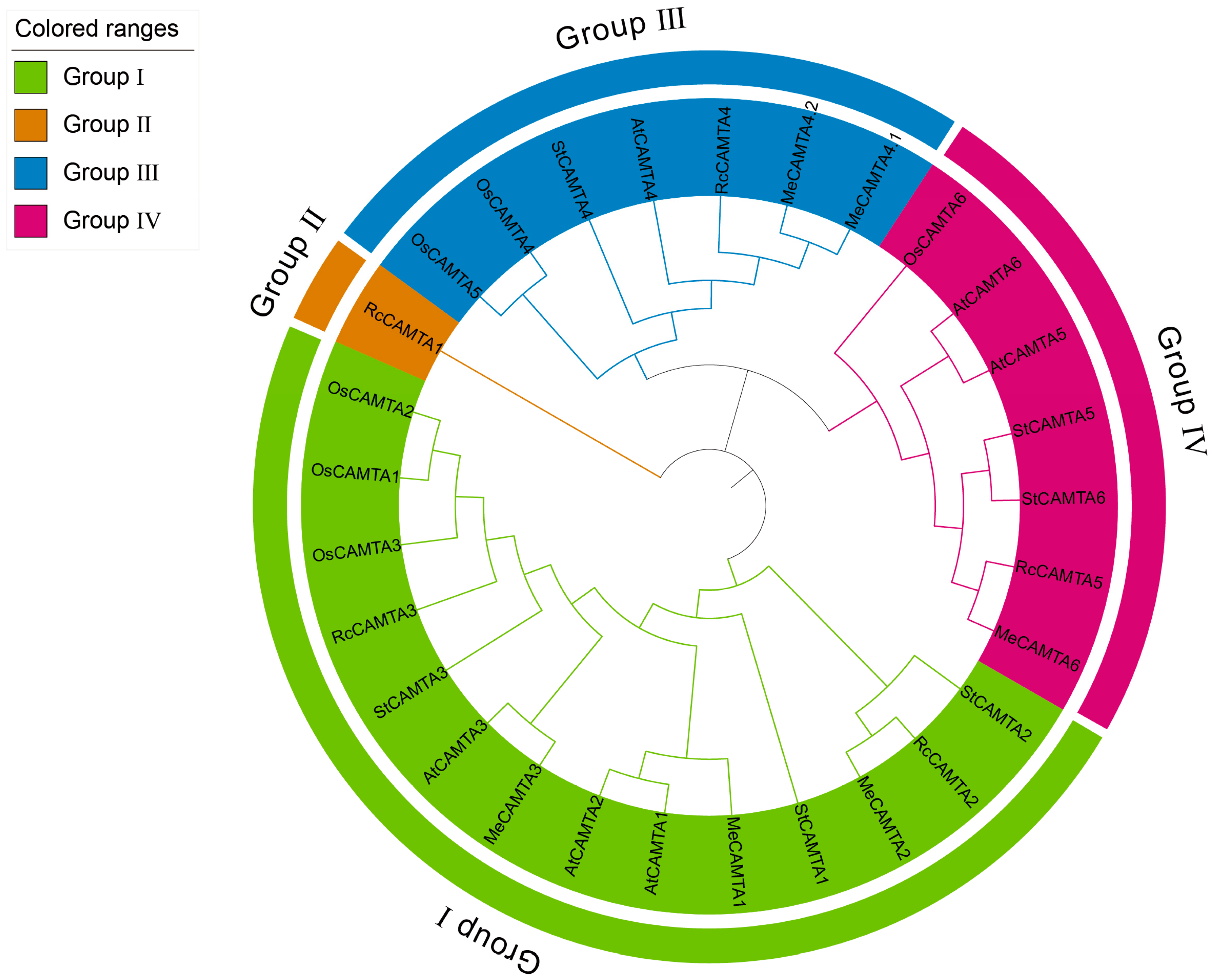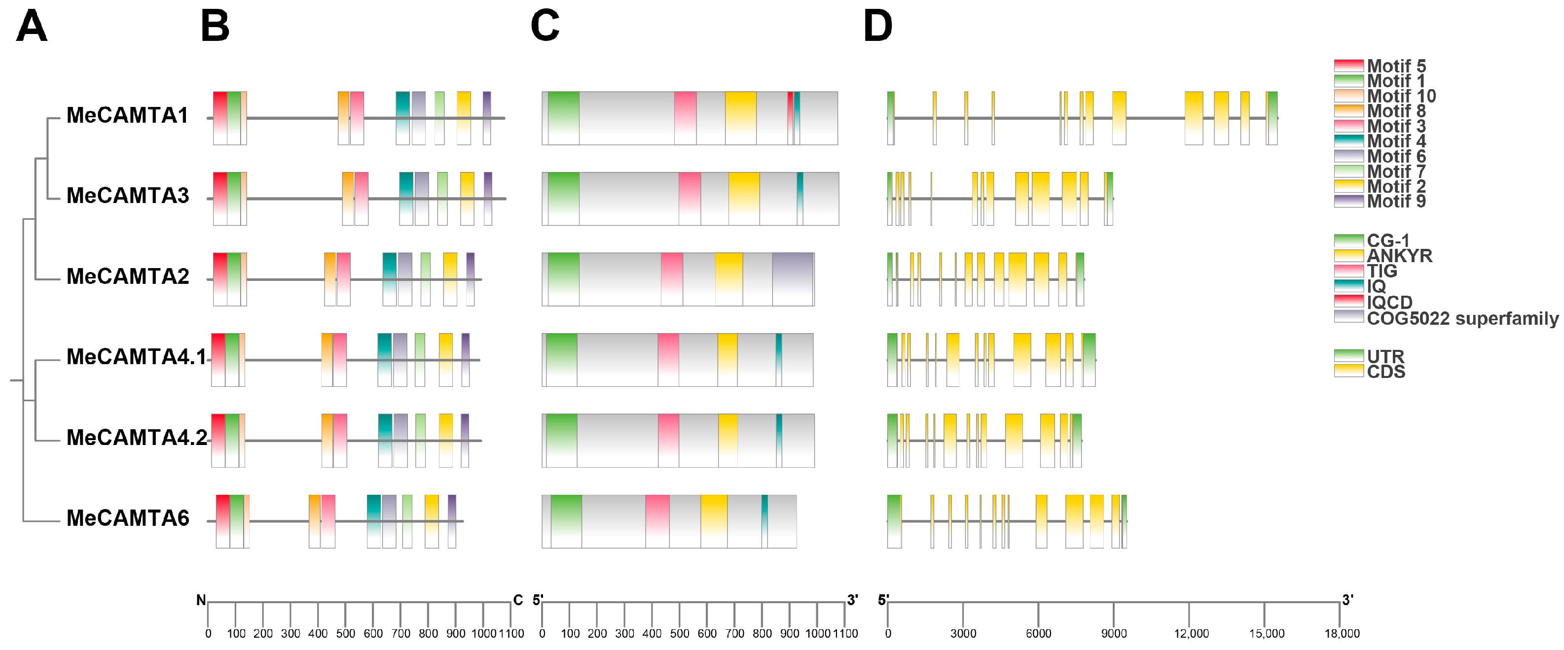 2.2. Phylogenetic Construction of the MeCAMTA Gene Family