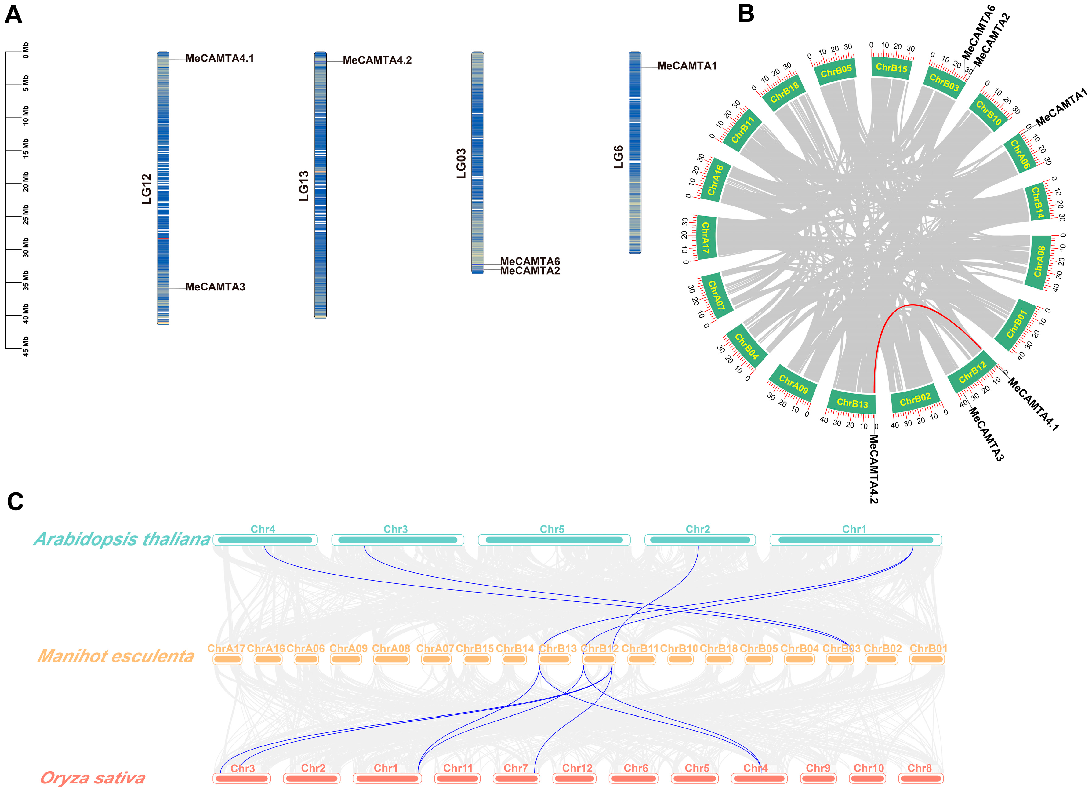 2.3. Chromosomal Localization and Homology Analysis of MeCAMTAs