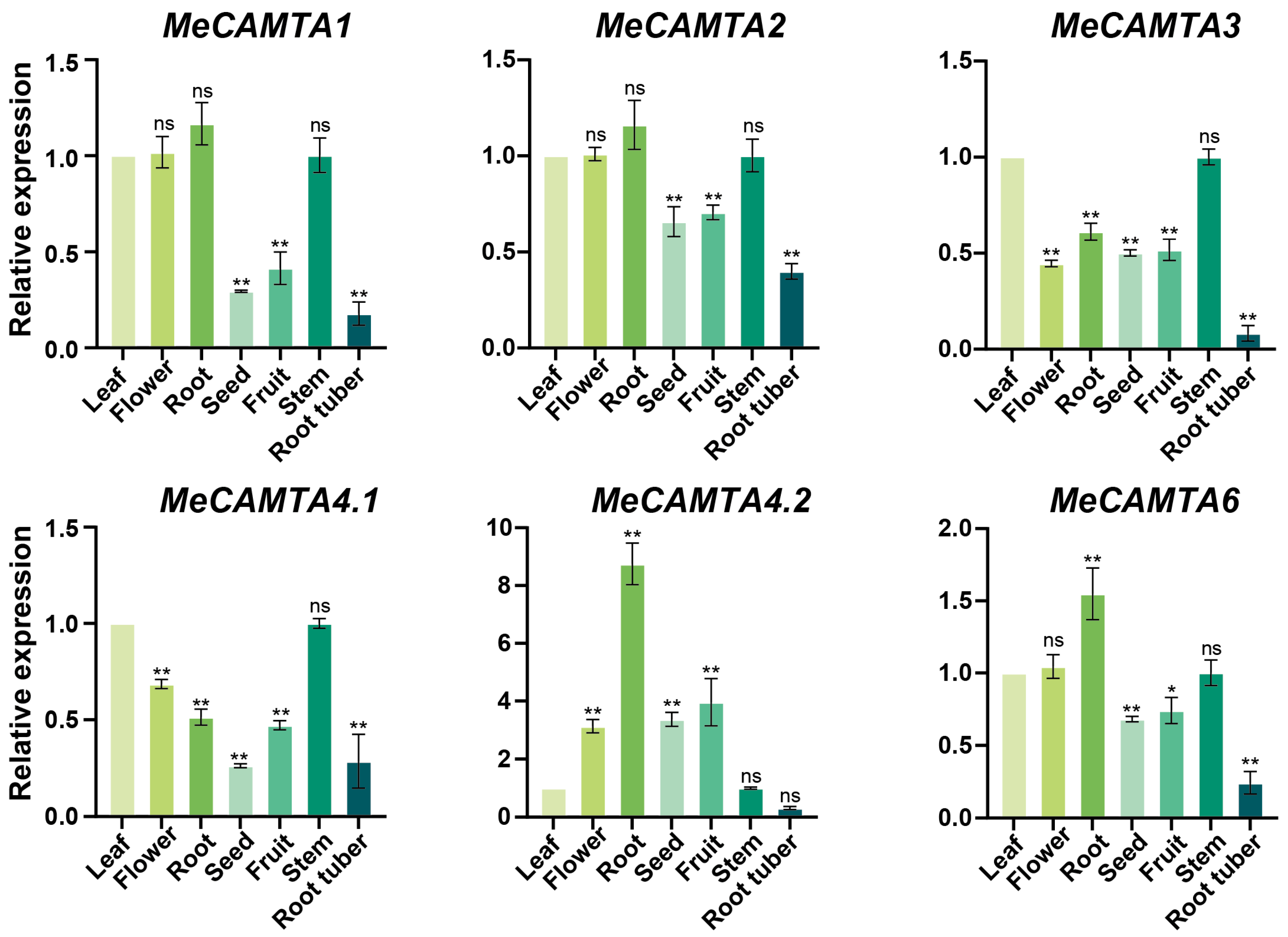 2.7. Tissue-Specific Expression Profiles of MeCAMTA Genes